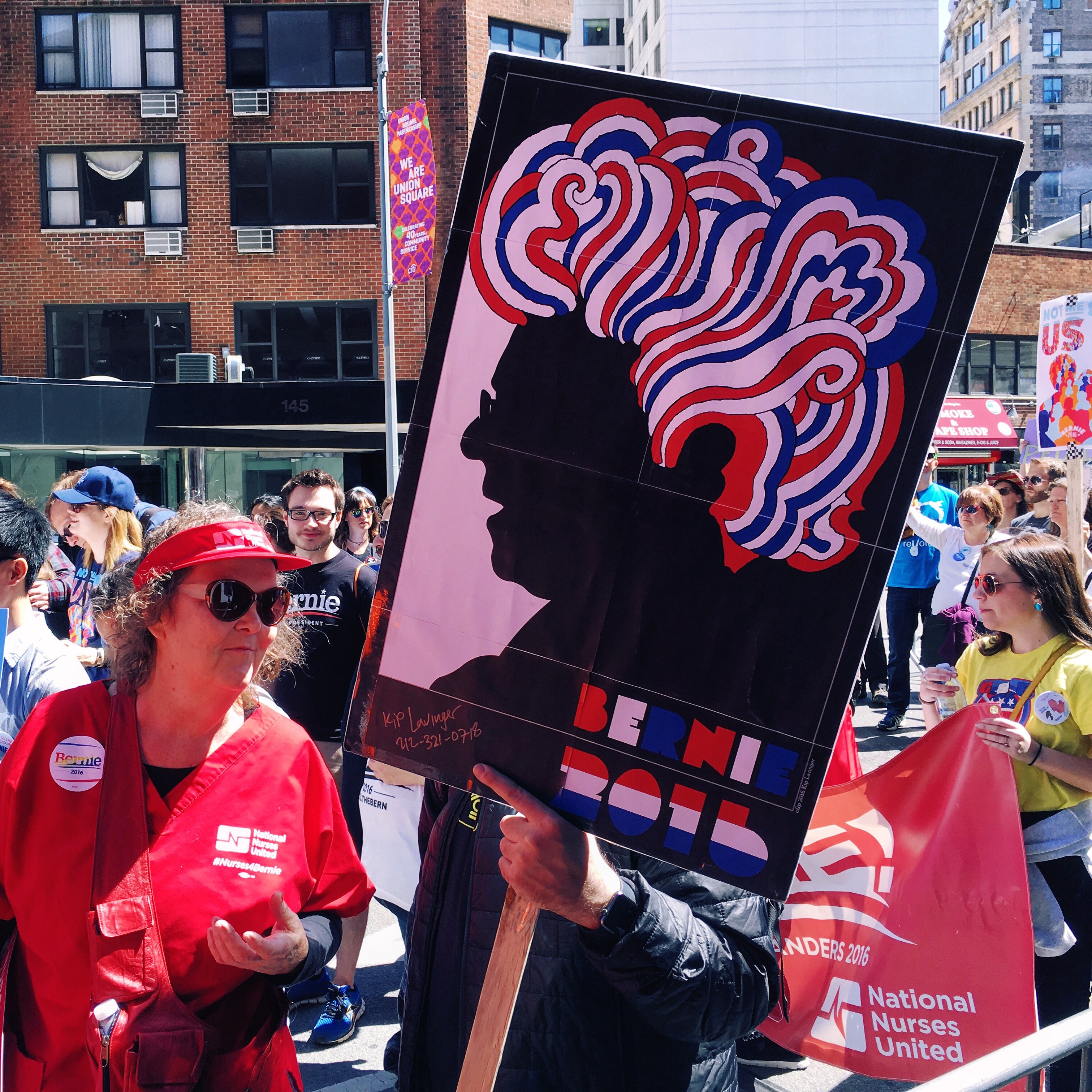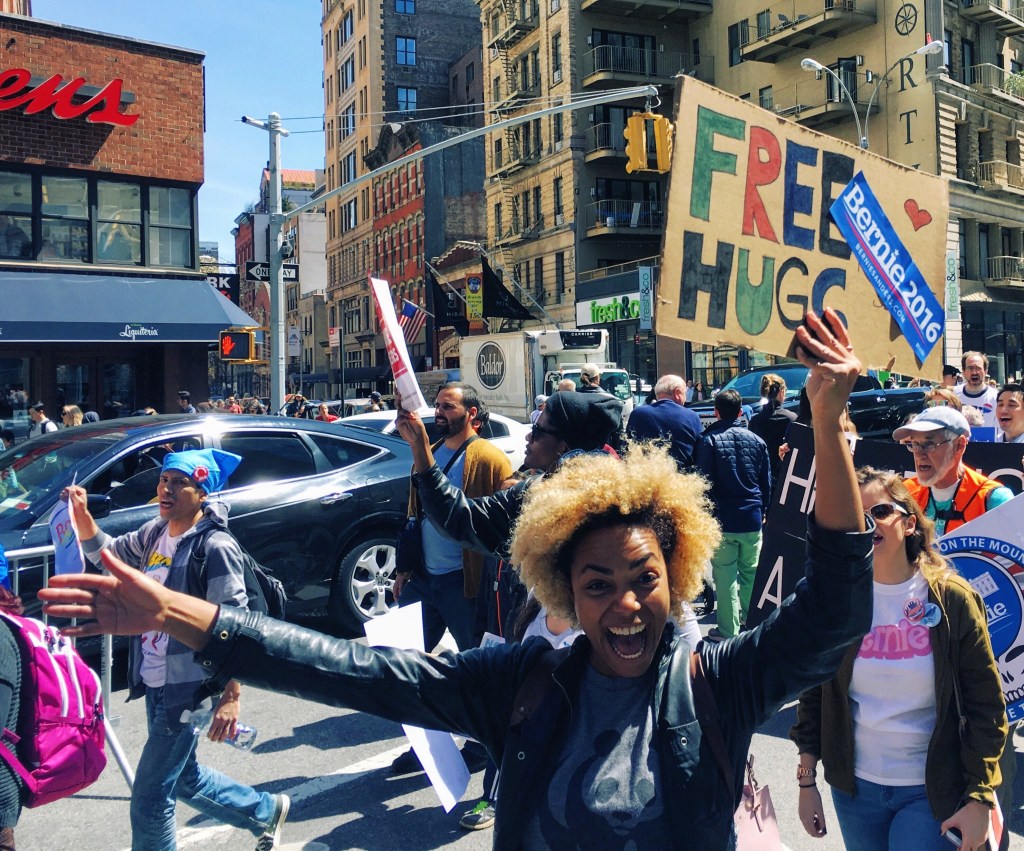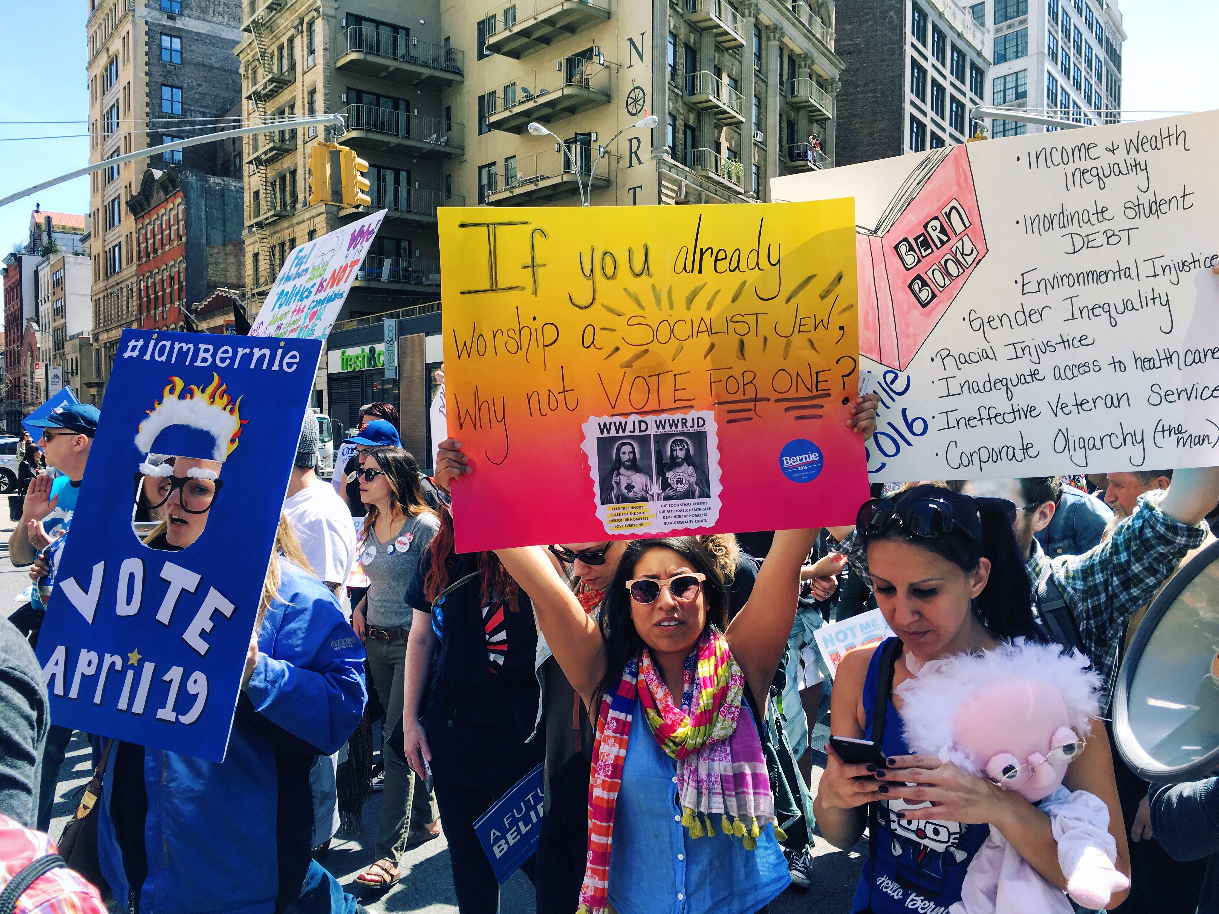 A sign-wielding parade to the Bernie Sanders rally in Union Square Park.