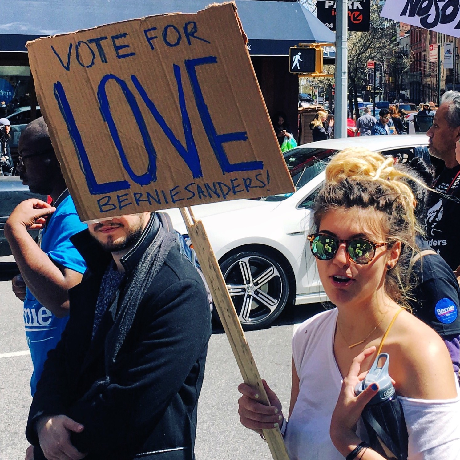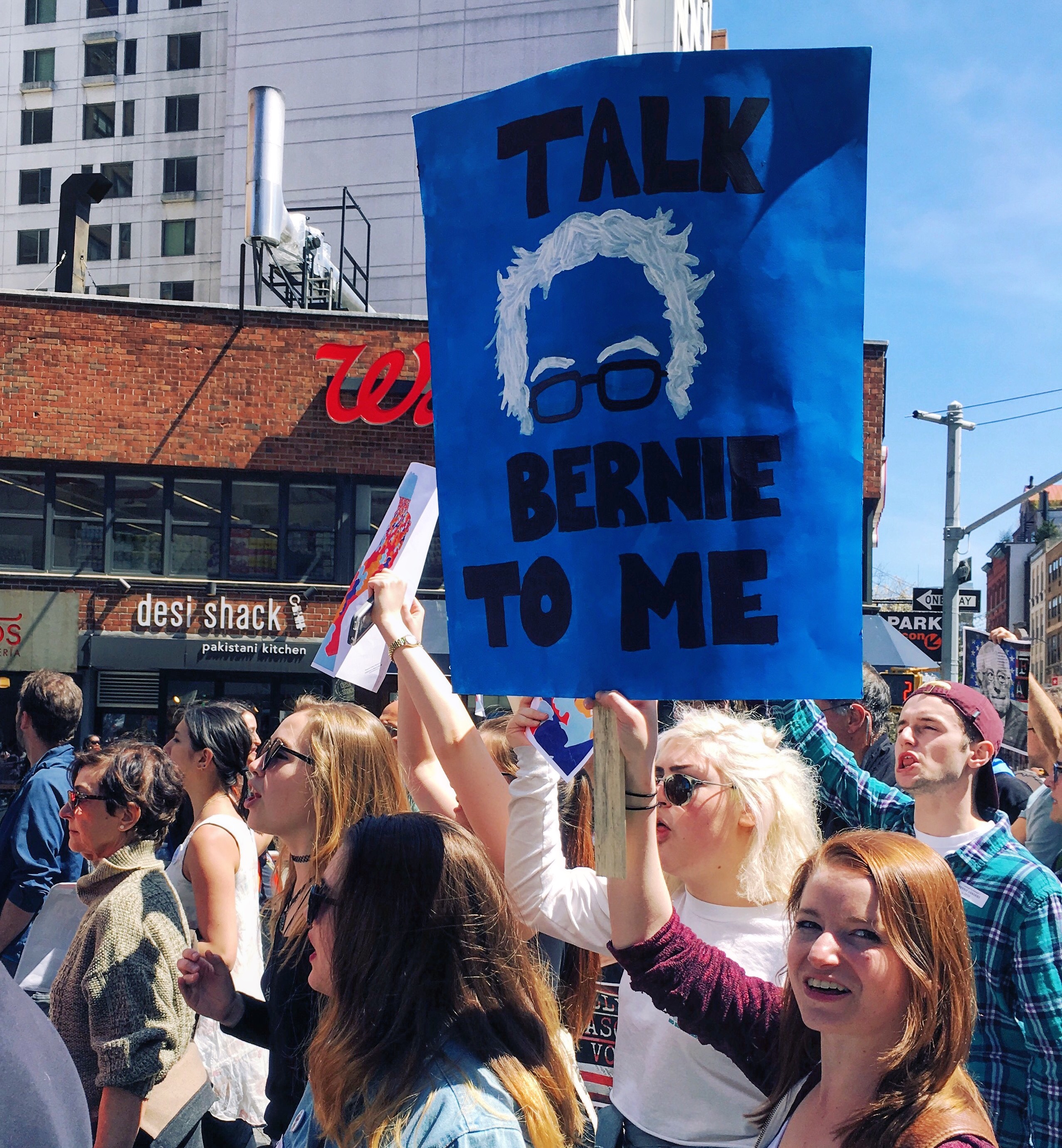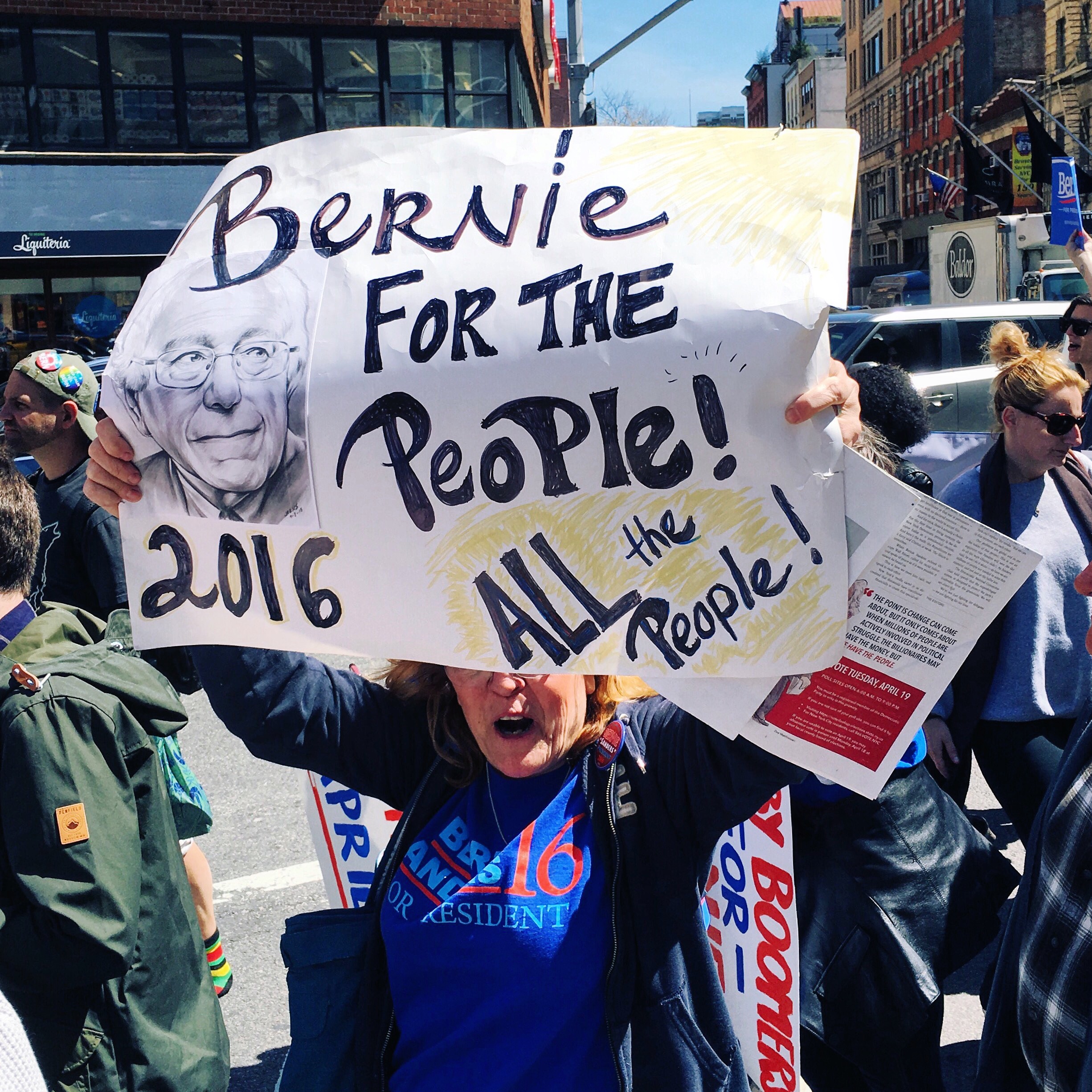 A sign-wielding parade to the Bernie Sanders rally in Union Square Park.