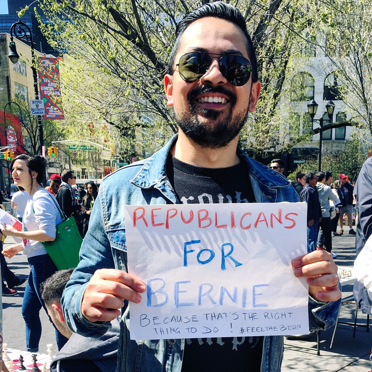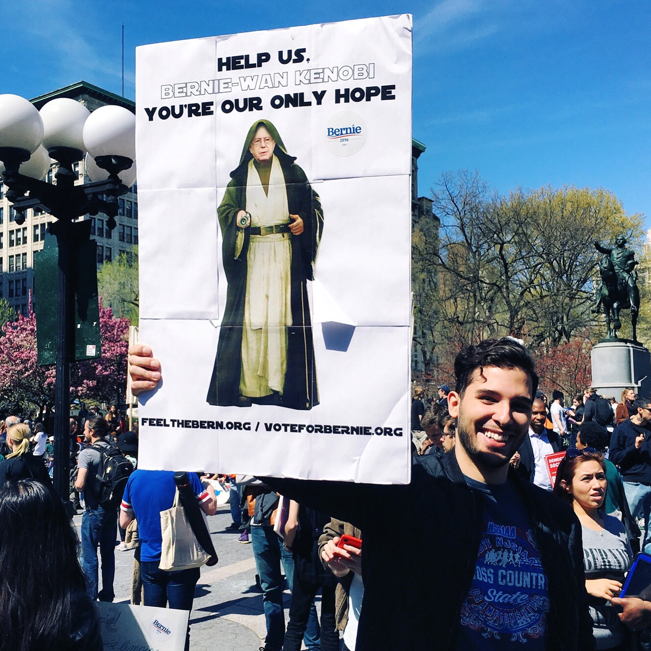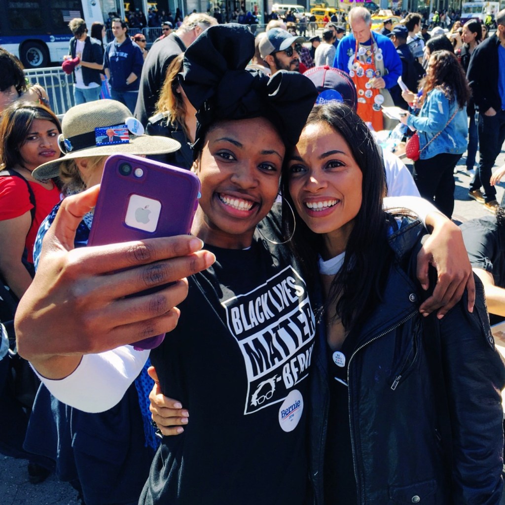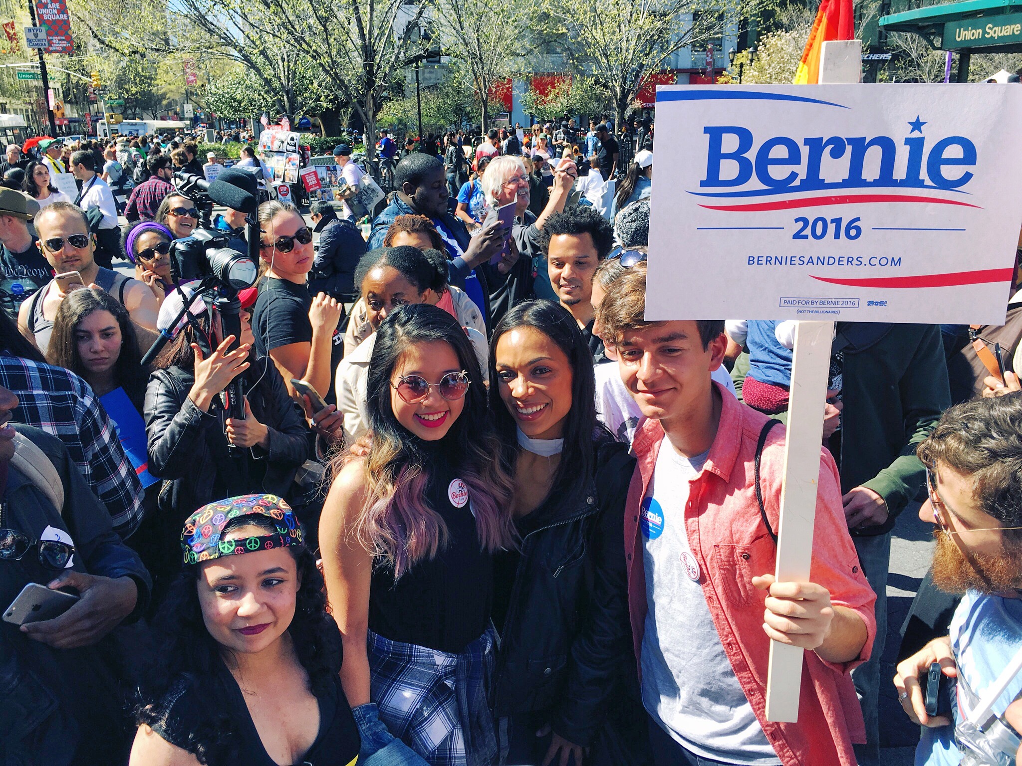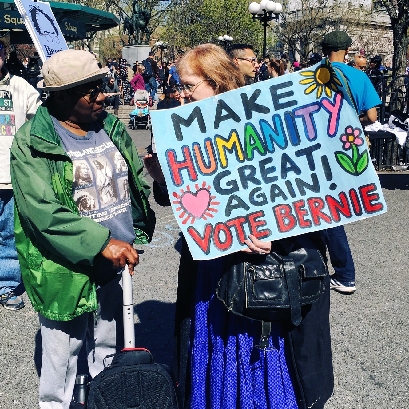 So, three weeks later, I am posting my gallery of images from the Bernie Sanders rally and gathering of supporters in Union Square Park on April 16, 2016 in lower Manhattan, New York City. Several of them include Rosario Dawson, as she lingered with Bernie supporters (and fans) in the crowd after speaking briefly, offering inspiration and support of Bernie’s movement. I have to say, it truly felt like I was witnessing a growing movement, started and championed by Bernie, which will continue to grow whether he is nominated as the Democratic candidate, or not. The issues, goals, and passions of the people supporting Bernie certainly feel like a movement-in-progress, and it’s pulling in people from diverse political and social views. I’ve recently become aware of Republicans who would rather cross party lines to vote for Bernie — though 100% opposed to Hillary — than to vote for Trump or Cruz! Something really interesting is going on in the Bernie movement, if it can pull people together like that…