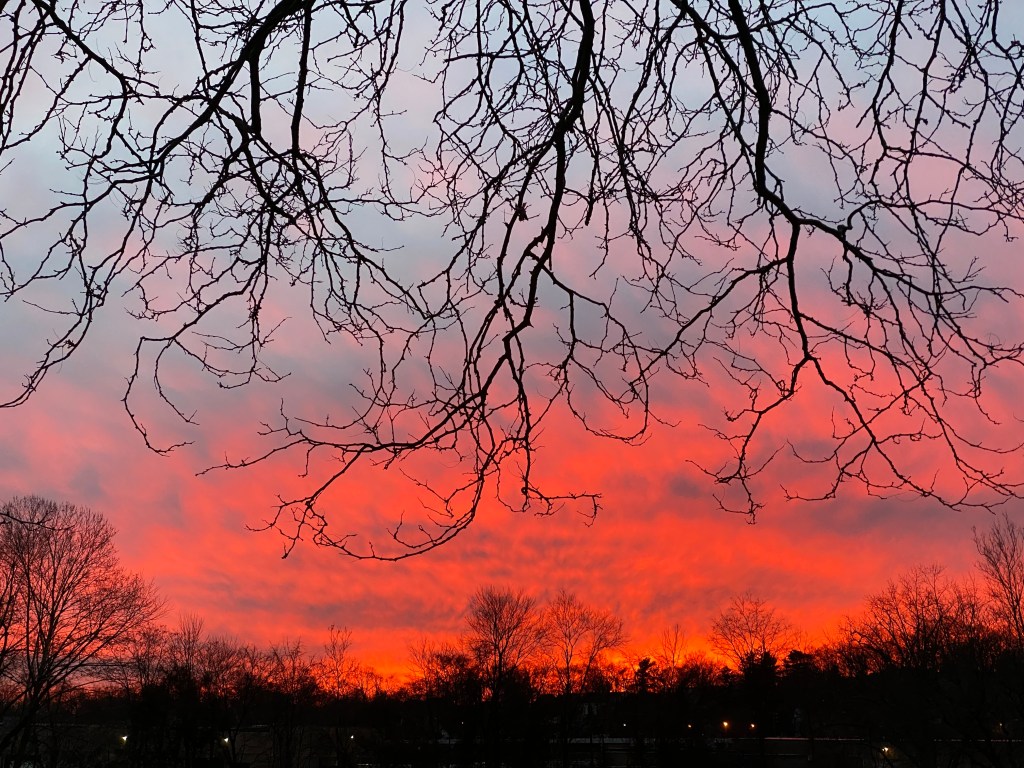 I was richly rewarded as colors deepened, decorating the clouds to the west, and then for a minute or two the sky blazed with rich reds and opulent orange…