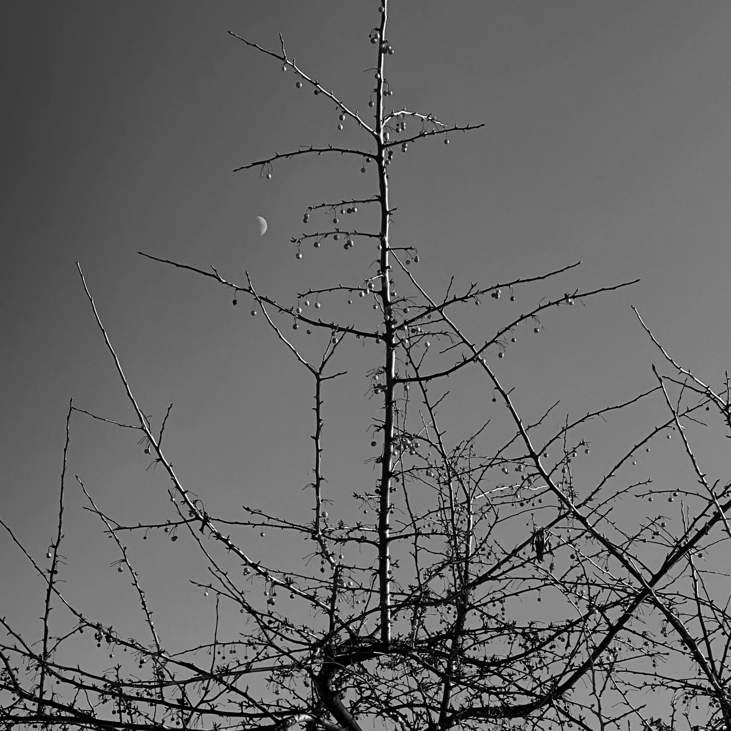The crescent, winter moon posed behind a leafless tree on a clear, cold afternoon.