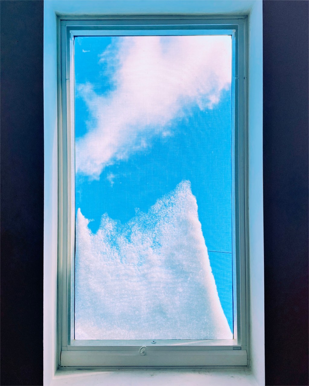 Through the skylight, cloud and snow complement each other against a bright blue backdrop.