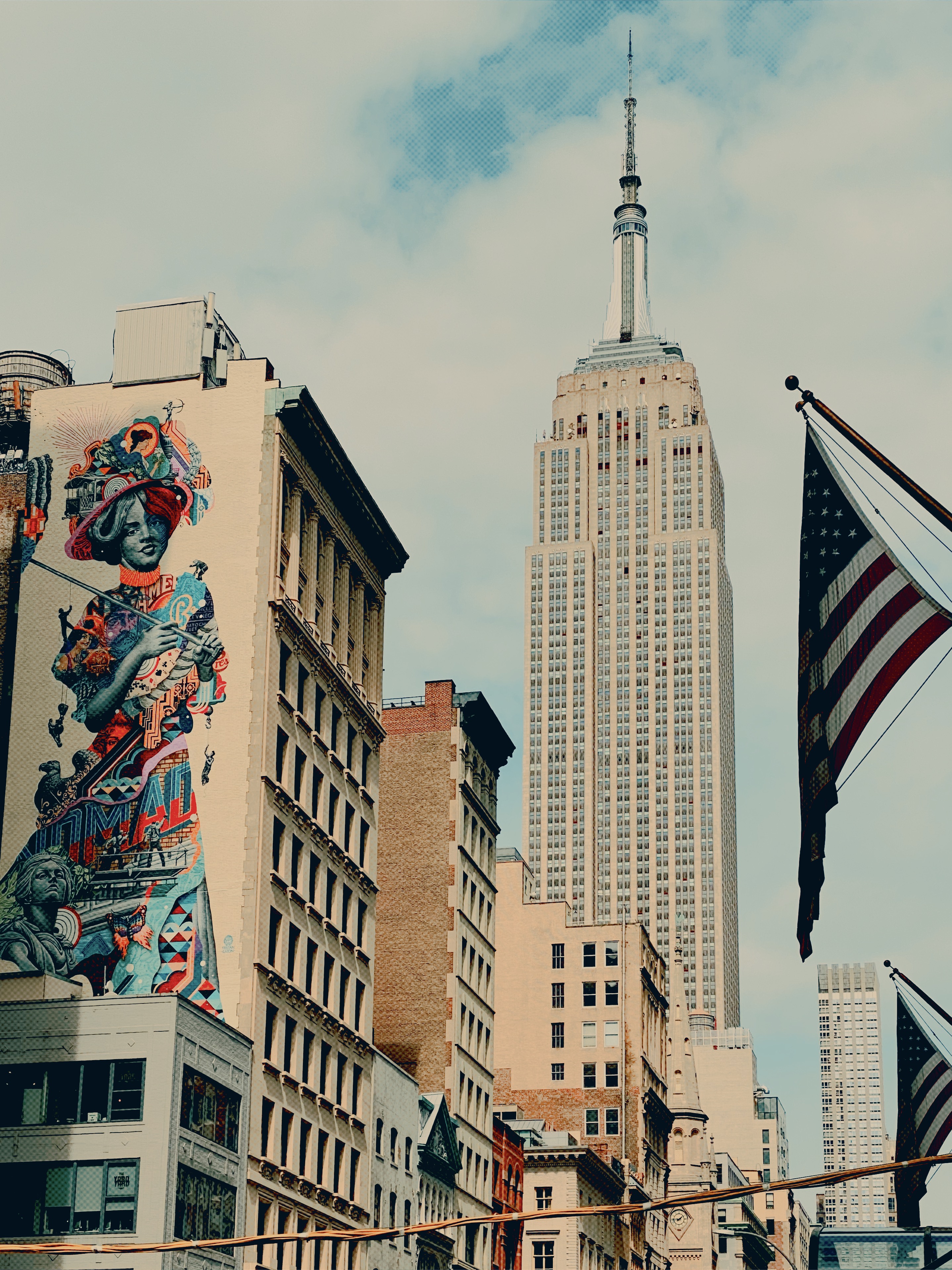 Subject(s): Looking north at Empire State Building, street art, flag.