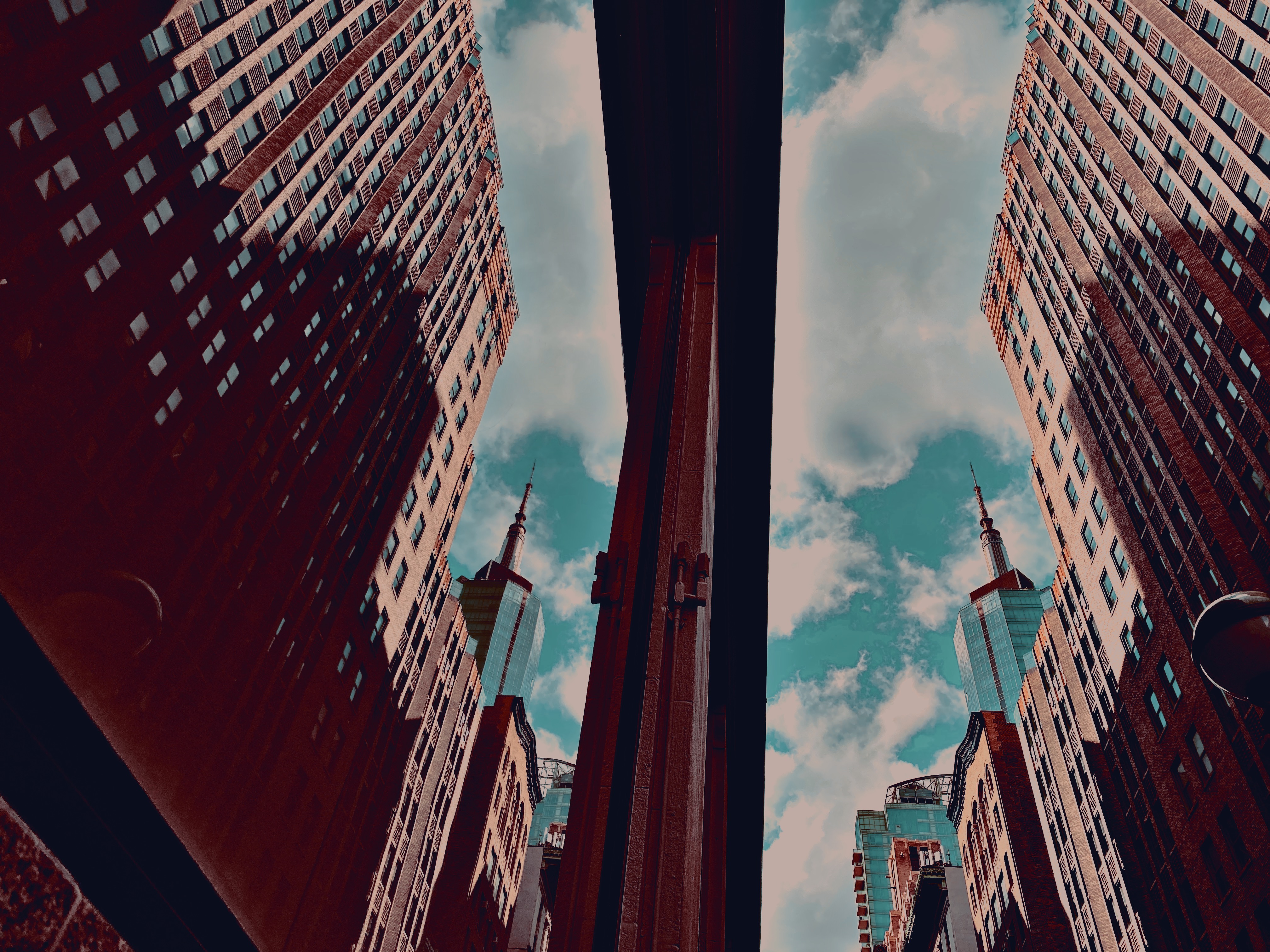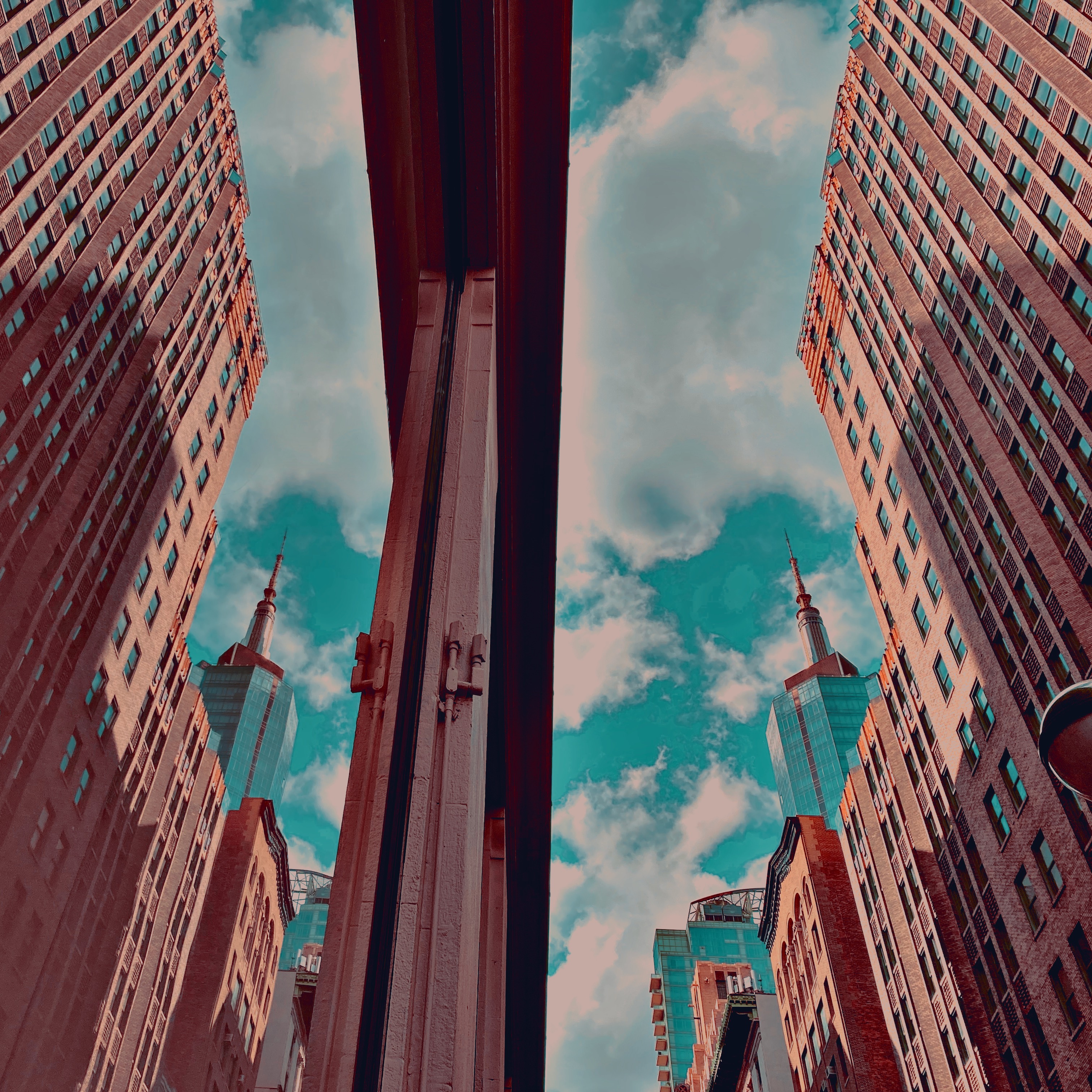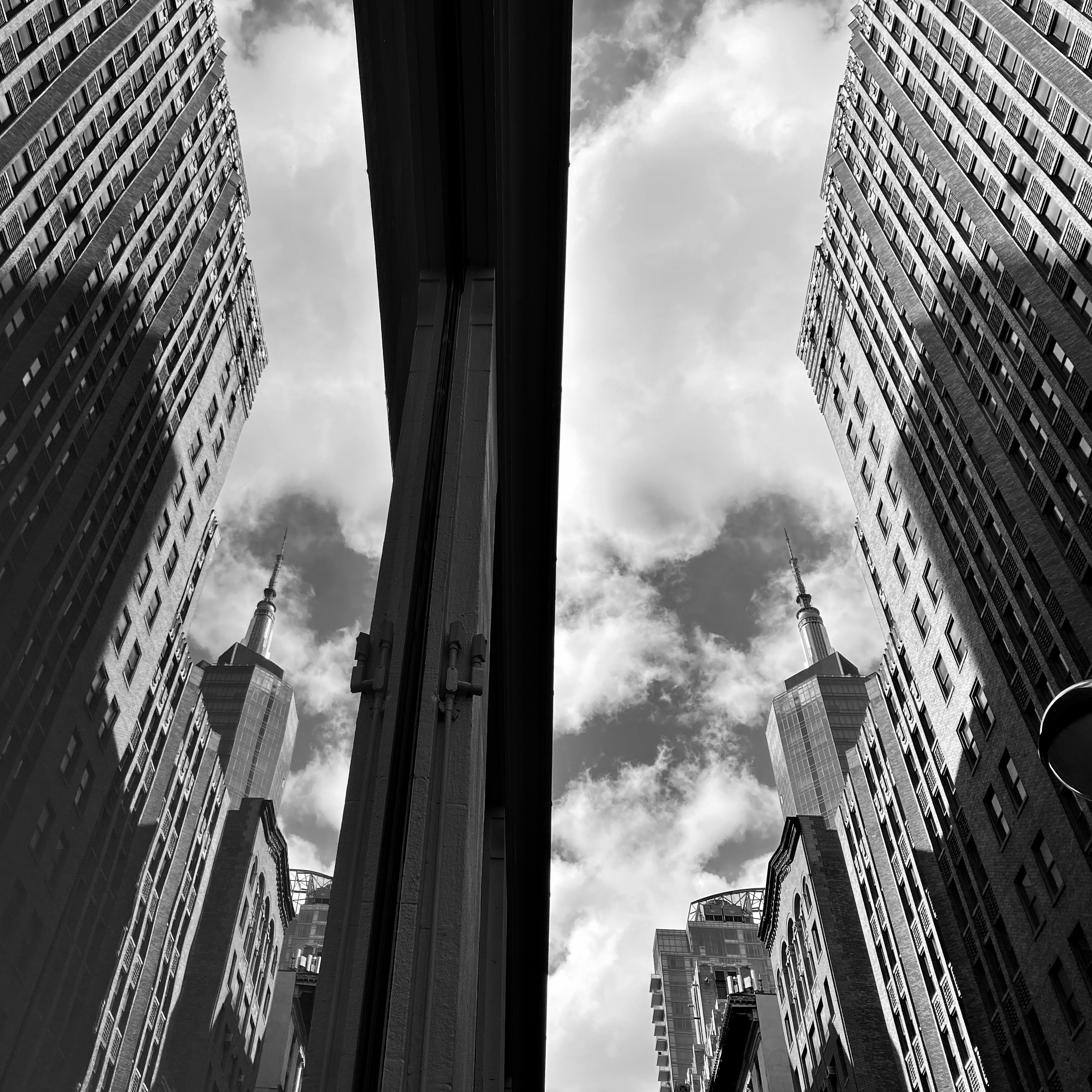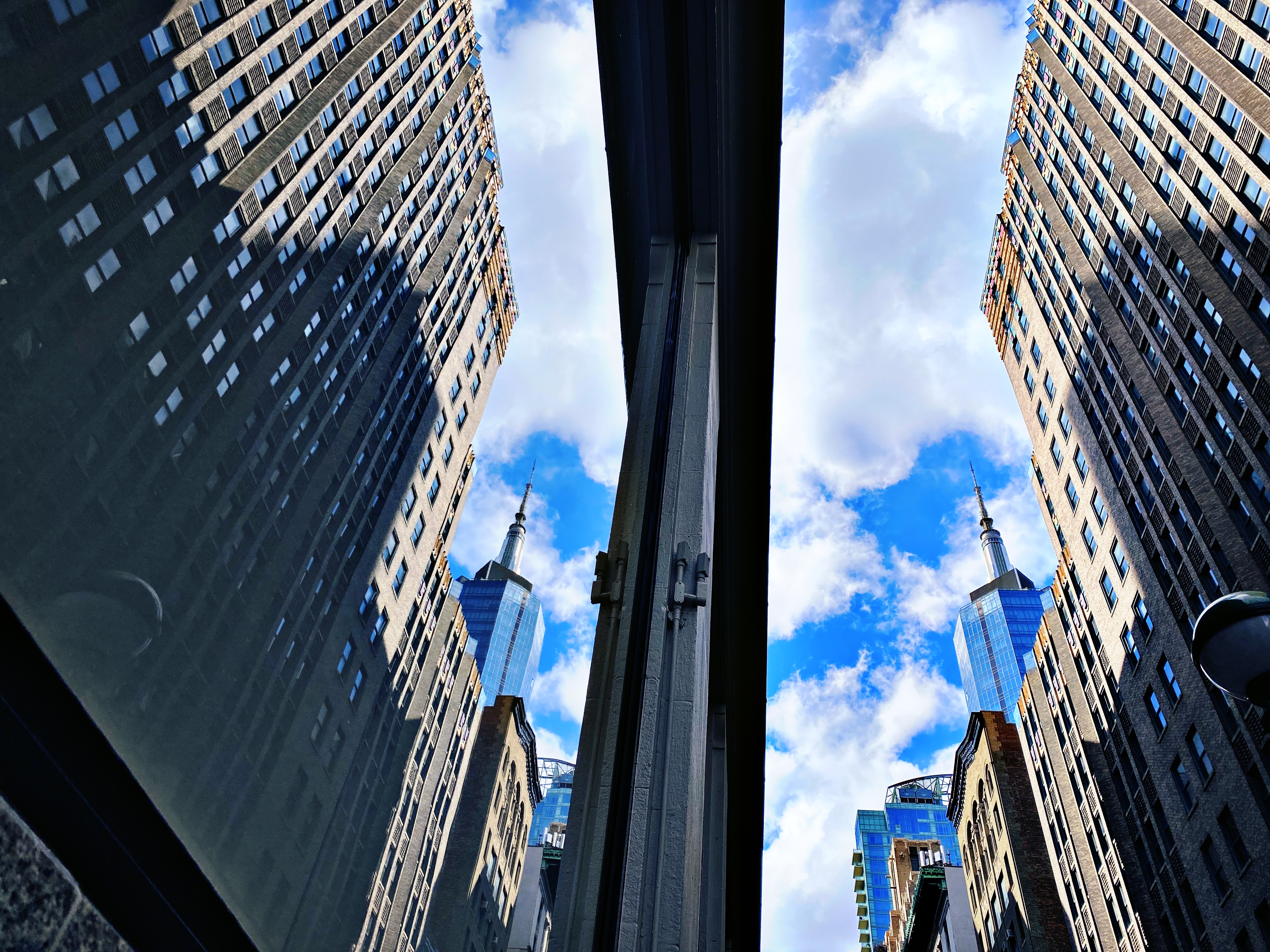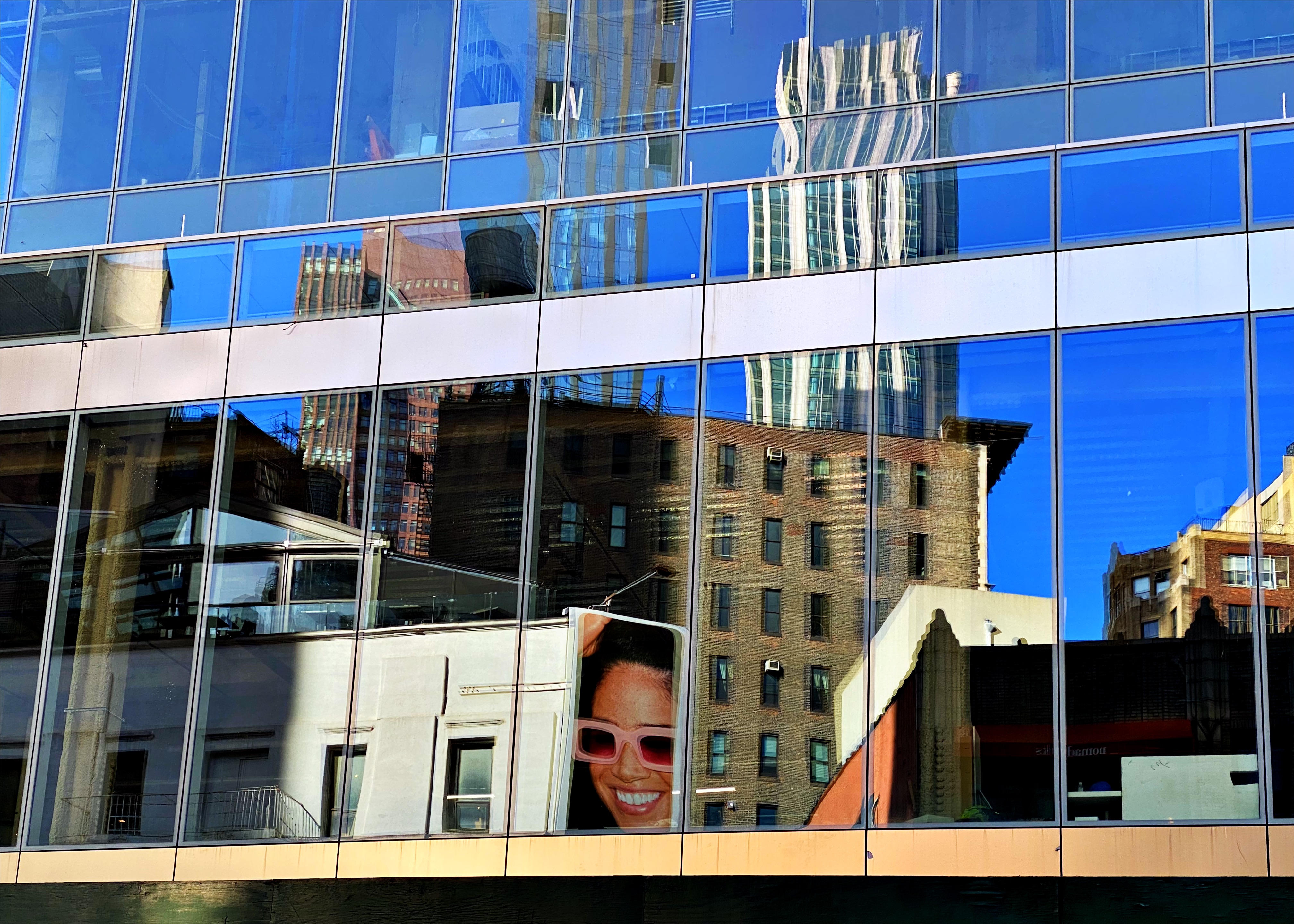 For example: walking south on the east side of Broadway between 30th and 29th, mid-afternoon with bright sun and a clear blue sky, I looked west at a glass-clad building, and noticed everything above and to my left (which I could not see directly) were reflected in it. West reflecting East… But the glass windows were not a perfect mirror, simply delivering a visual replica indistinguishable from the reflected things — metal beams formed a grid, rippled glass created distortions, and semi-transparency blended interiors with the reflection — imperfect, different, and IMHO better!