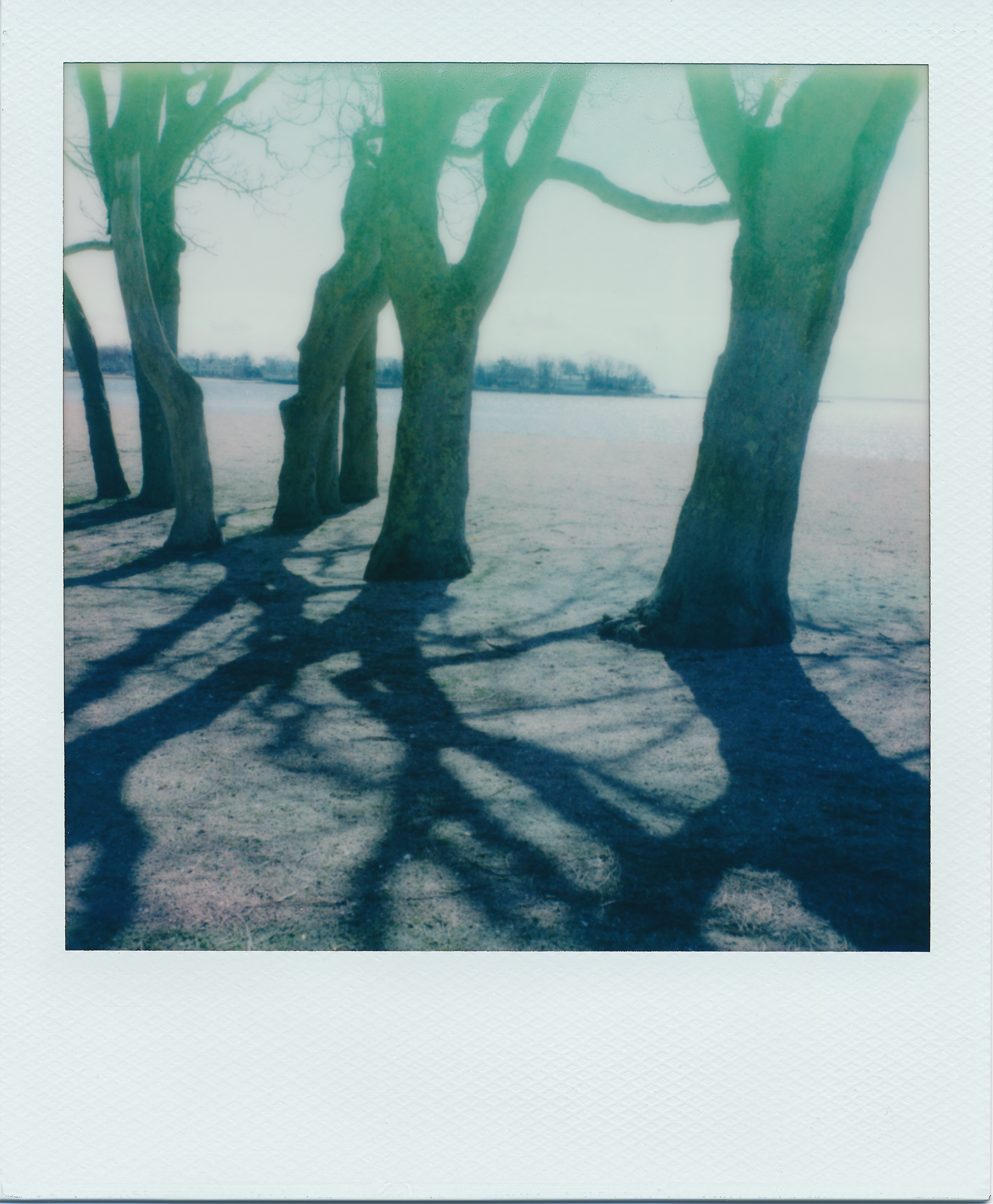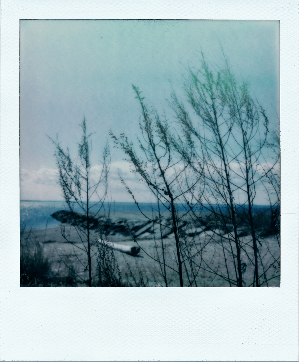 Today, without checking its age, I grabbed a pack of Polaroid 600 film that had been sitting out, unrefrigerated for a few months. After a morning walk at the beach, I got home and looked at the fully developed photos. The results were not what I expected — not wild or crazy as I described above — just a little “off” in some interesting ways. All three of these shots taken by the shore were washed out and high-contrast, with a blue-green color shift, loss of detail, and lots of tiny bubbles in the developer. But the one on the left (below) had some great streaking and wrinkling that I could appreciate. What do you think?