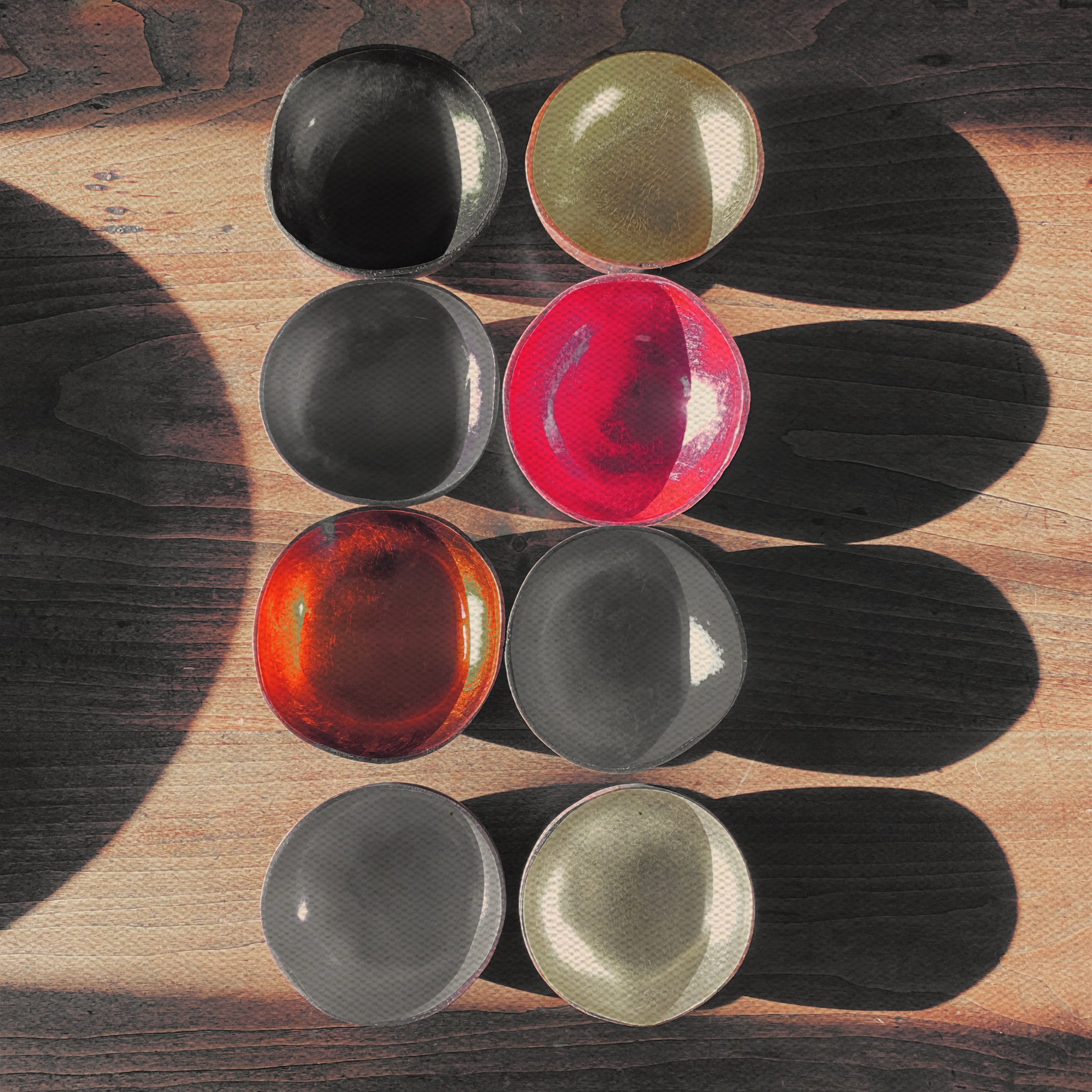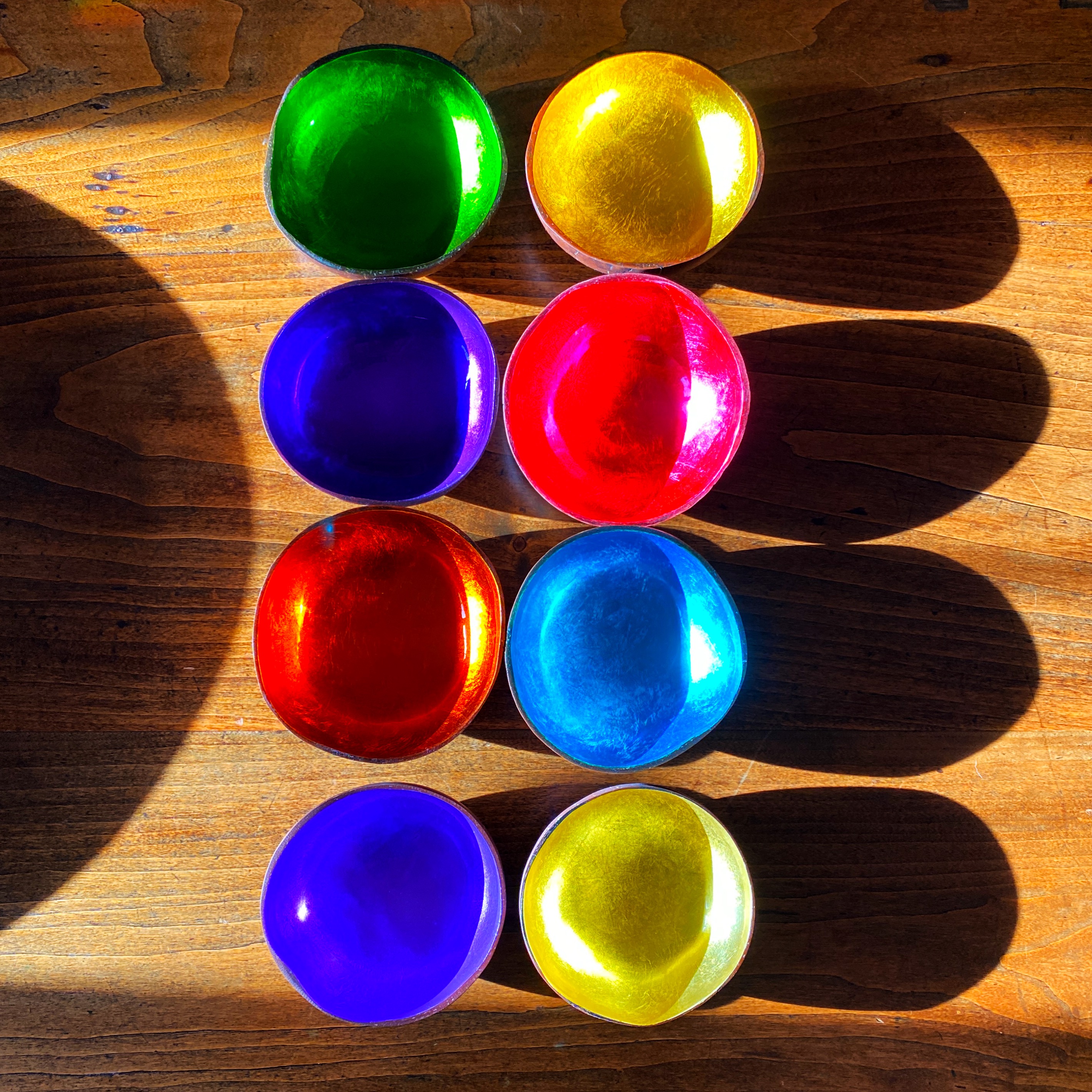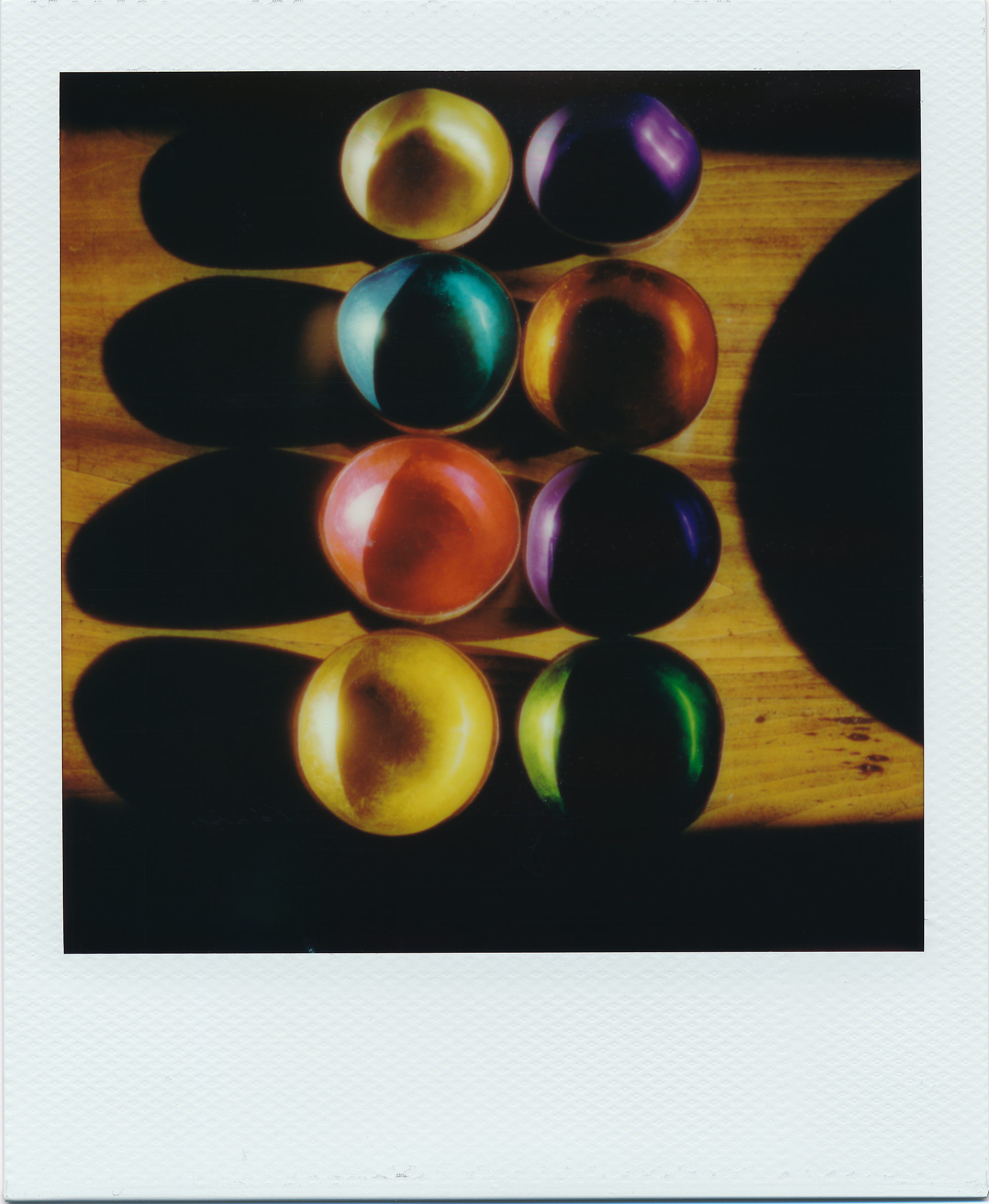 I love these brightly painted (purportedly food-safe) coconut bowls from Indonesia. The know-it-all man at the estate sale where I bought them said they had been lovingly collected by an opera diva on one of her many trips to Asia. They sit on a table in the living room that only gets sunlight in late afternoon, but not in the wintertime. It’s a three-season, spring-summer-fall thing, which was in full effect when I walked in today! The bowls, their colors, and shadows were glowing in the warm-hued, late afternoon sunlight. First, the Polaroids: