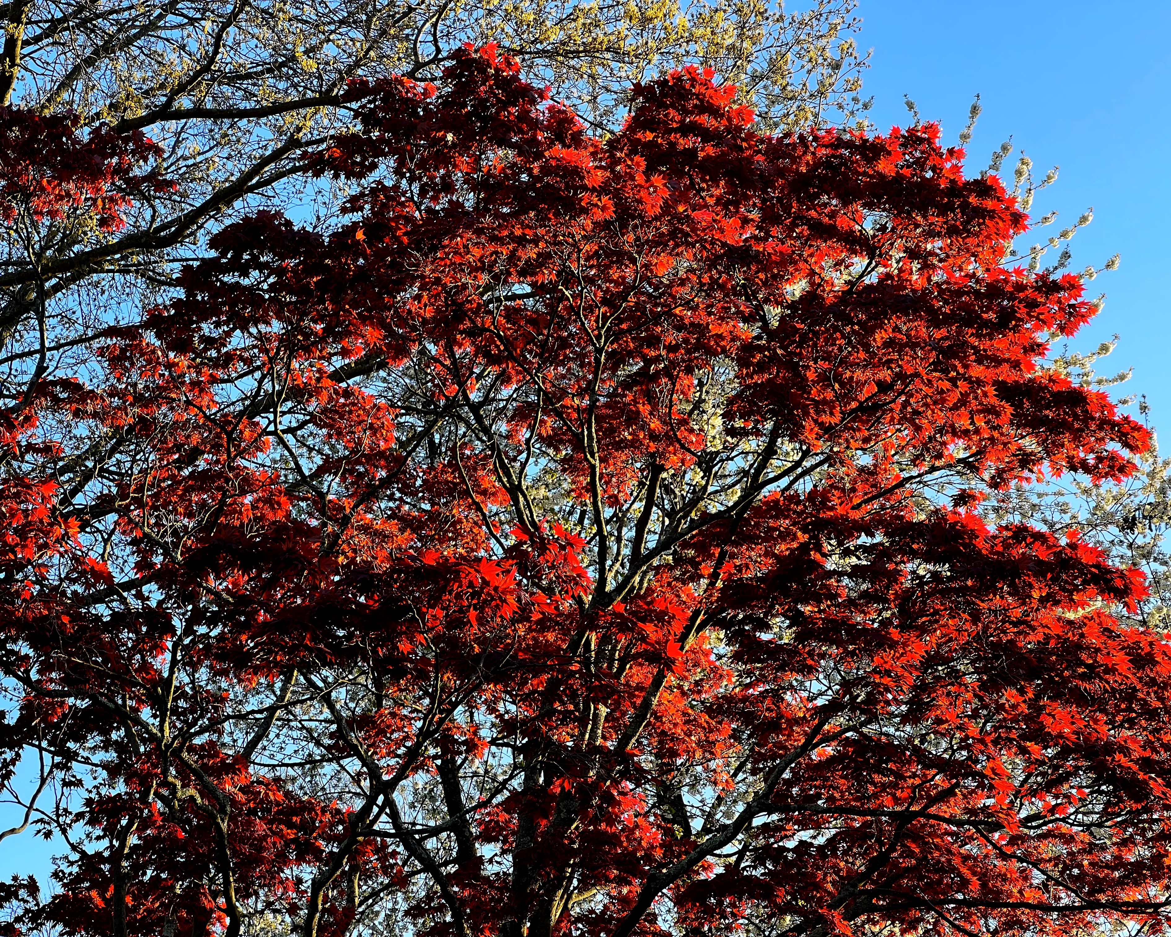 Each year, there is a 4-8 day period, when three marvelous colors may be seen juxtaposed, alongside, sharing airspace, and in close proximity to each other. It’s a matter of seasonal timing, as spring unfolds and days become warmer. I’m talking about the forsythia’s bright yellows, the Japanese maple’s deep reds, and the black cherry’s white blossoms, which overlap beautifully (in my region) sometime in the last weeks of April and first weeks of May.
