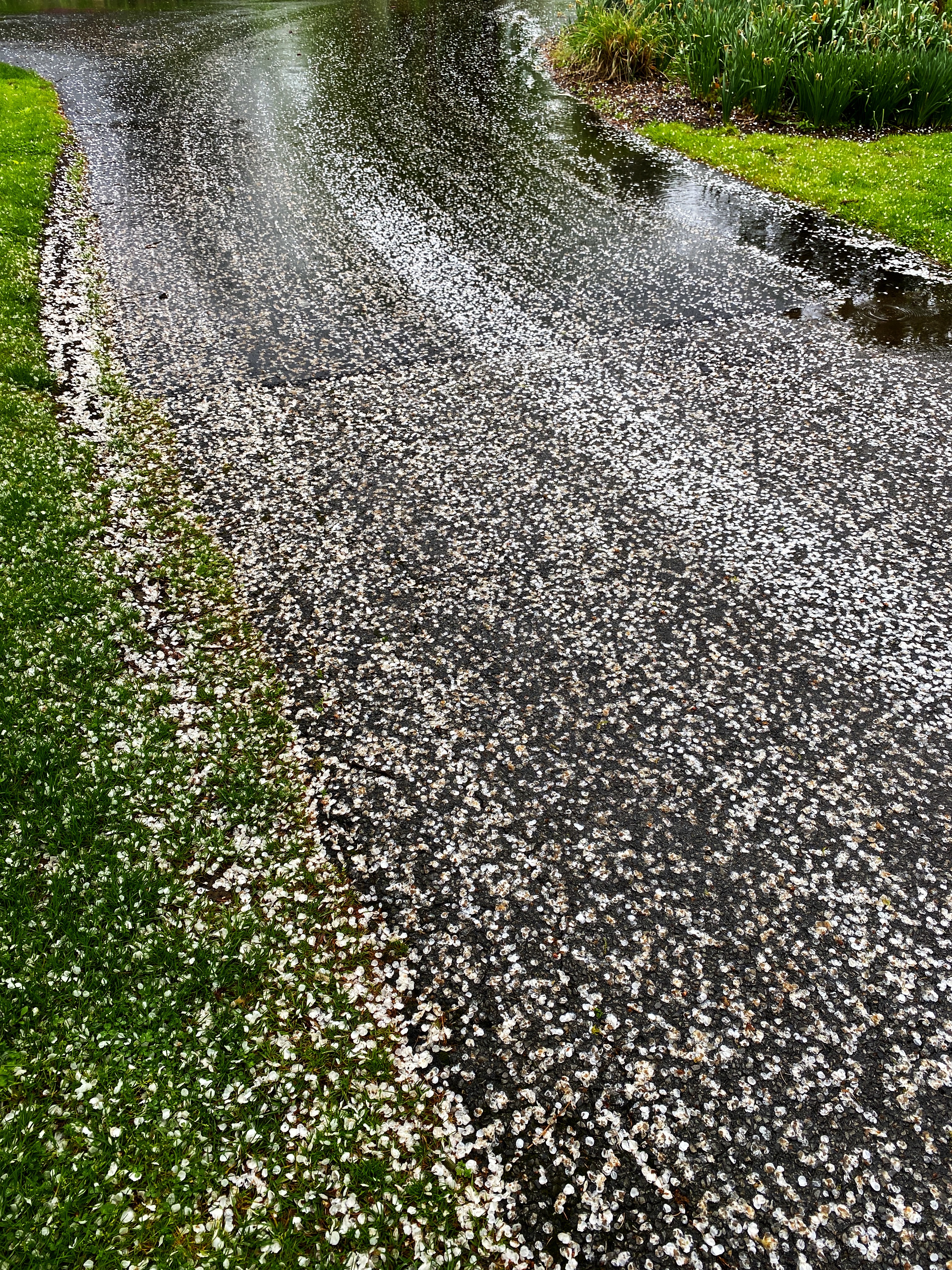 I’m not talking about the patterns of flowers — their parts, forms, shapes, variations — much has already been written on those topics. Instead, on this rainy day, I was fascinated by the patterns made by petals fallen (from a wild black cherry tree) on grass, ground, and pavement.