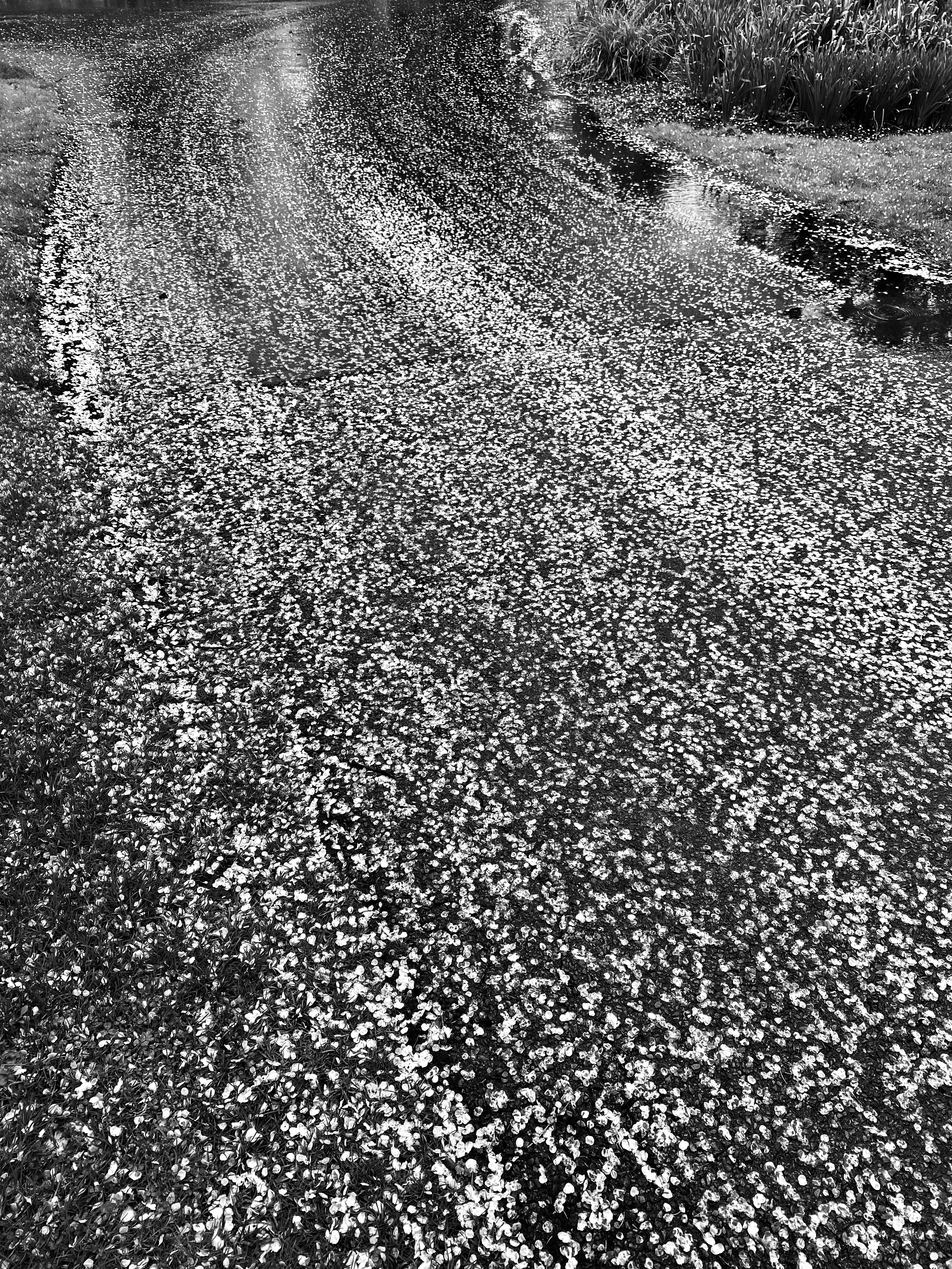 The photos are gloomy like the day’s weather, but I hope you will enjoy (as I did) the patterns of petals on the pavement, painted-in-place by passing vehicles, and passersby. The featured photo on this post (above) is a “Martian” grass edit I did for fun. Here are the “realistic” and “monochrome” edits: