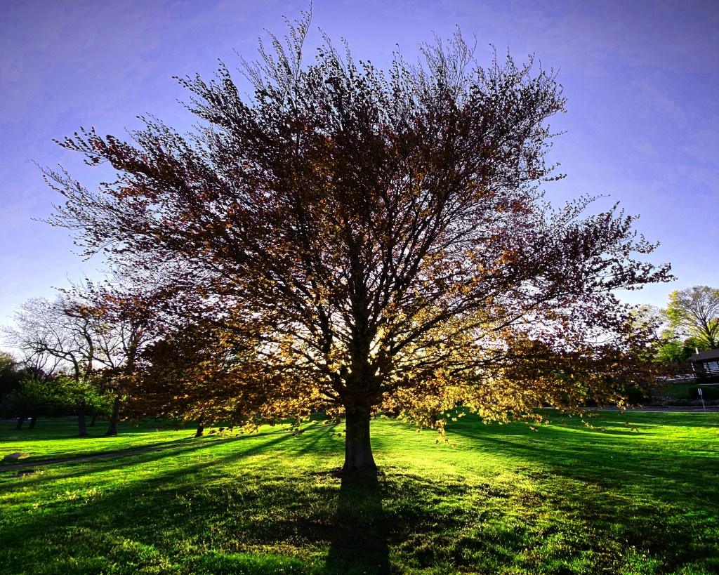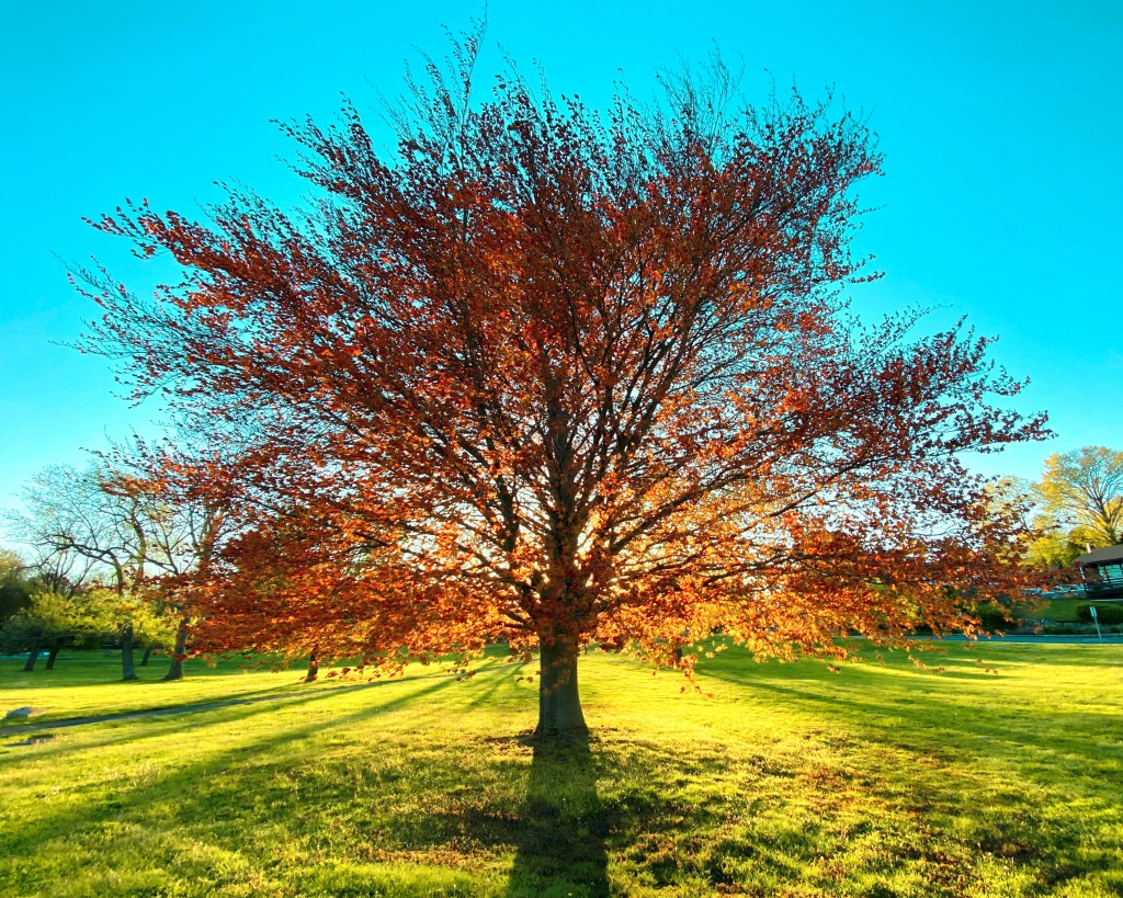 I noticed this same tree in previous years and researched it last year. Turns out to be a Copper Beech aka “Purple Beech” originally native to Northern Europe. It’s a rare, beautiful, mature specimen for North America these days, because a blight is killing off so many, especially the young trees. Does its rarity make it more beautiful? Feels like it does.