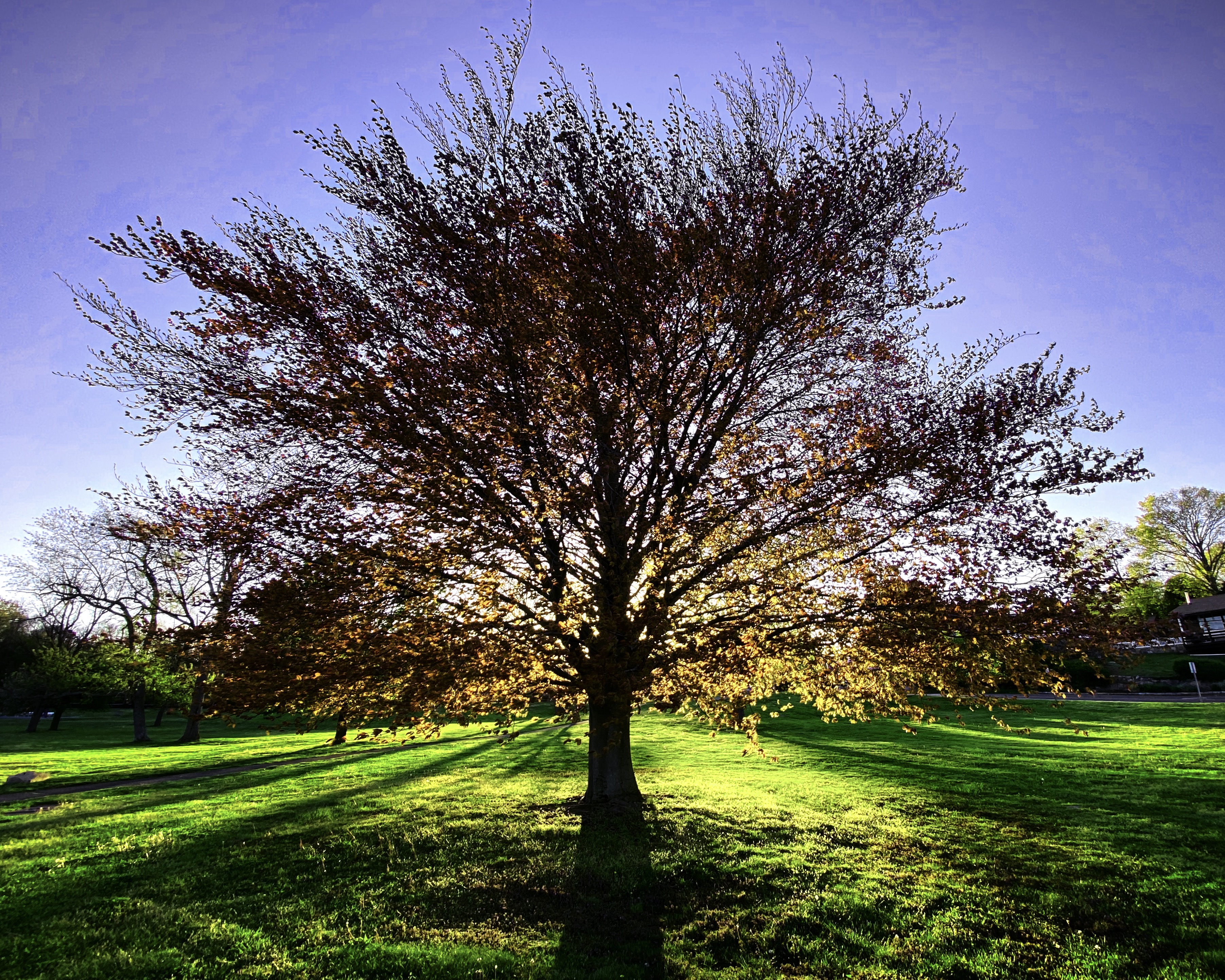 I noticed this same tree in previous years and researched it last year. Turns out to be a Copper Beech aka “Purple Beech” originally native to Northern Europe. It’s a rare, beautiful, mature specimen for North America these days, because a blight is killing off so many, especially the young trees. Does its rarity make it more beautiful? Feels like it does.