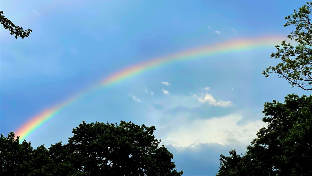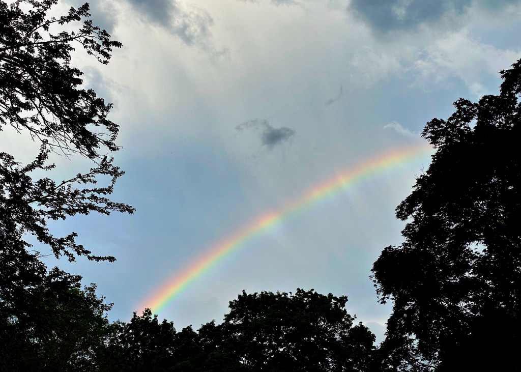 While the afternoon thunderstorm gathered in the west, swept in swiftly, deluged, and blew by to the east, the sky was talking continually. It was a conversation between wind and layers of clouds at different altitudes, moving at different rates of speed and acceleration, across a bright, blue background. After it passed, the storm gifted us with a rainbow to the east, as it continued to raged and rampage off into the distance. We were left, drenched and dampened — skin, hair, clothes, not our spirits — but delighted!