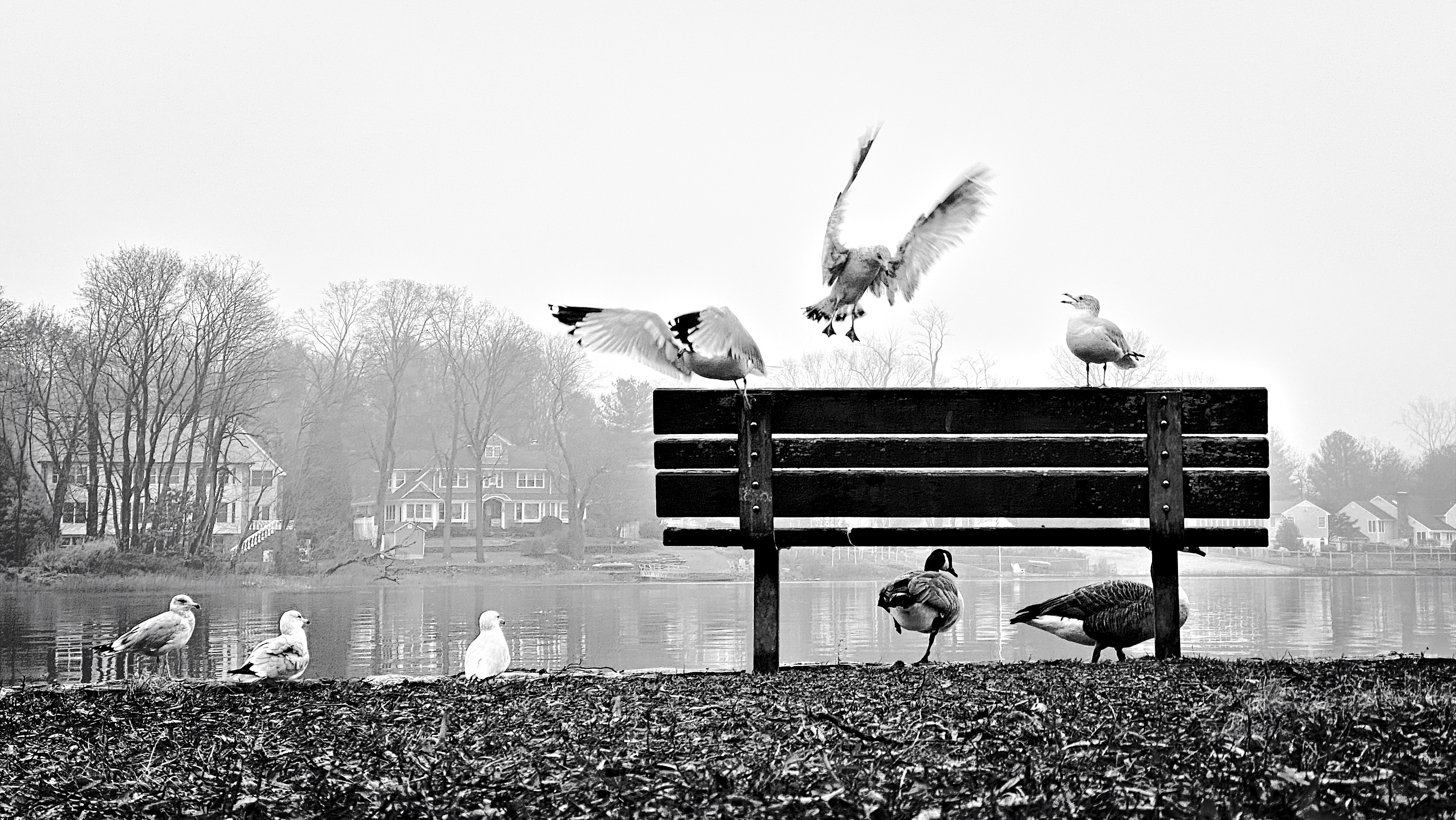 And, from a January post, here’s a set of back-views of a bench with birds instead of people, which has plenty of monochromatic moodiness: