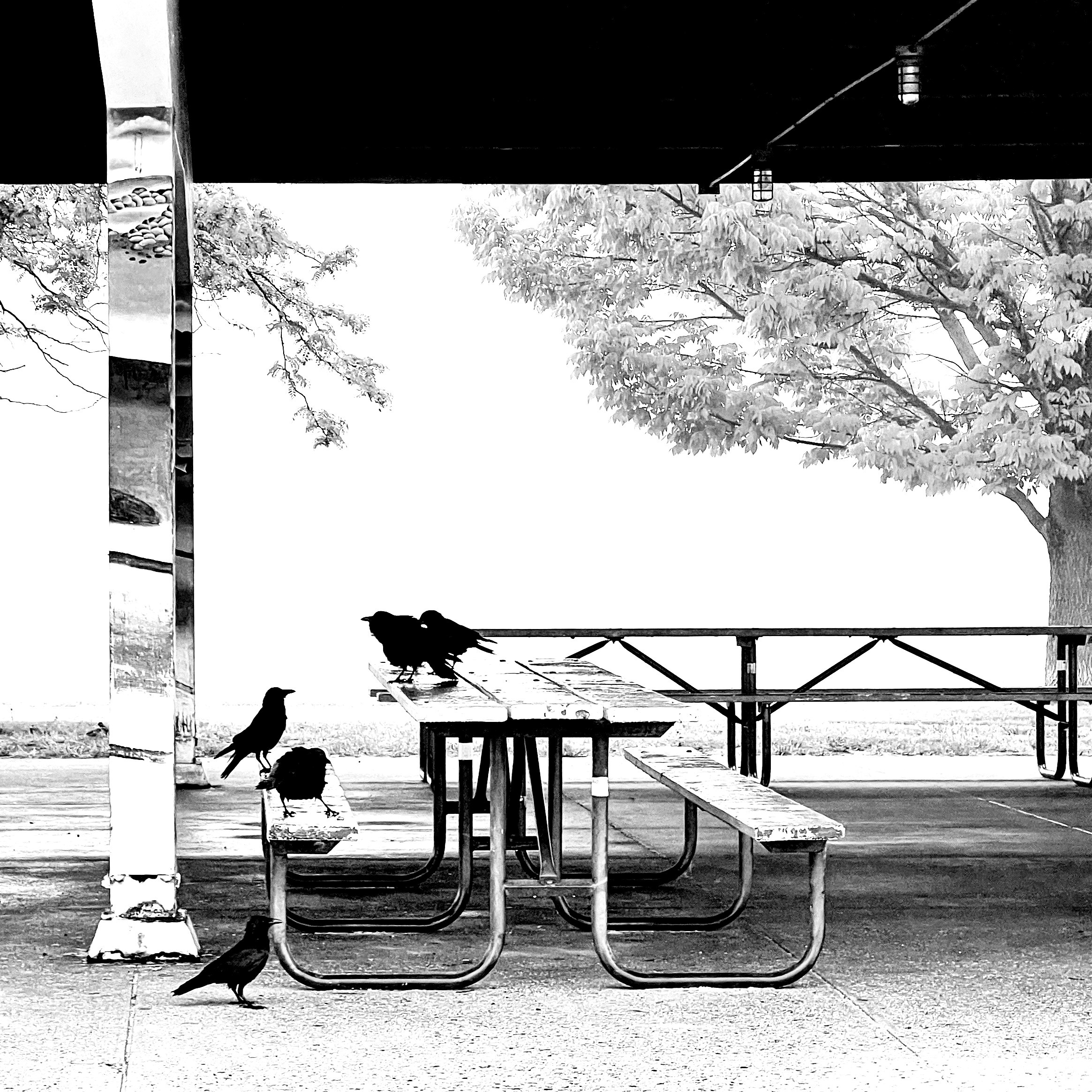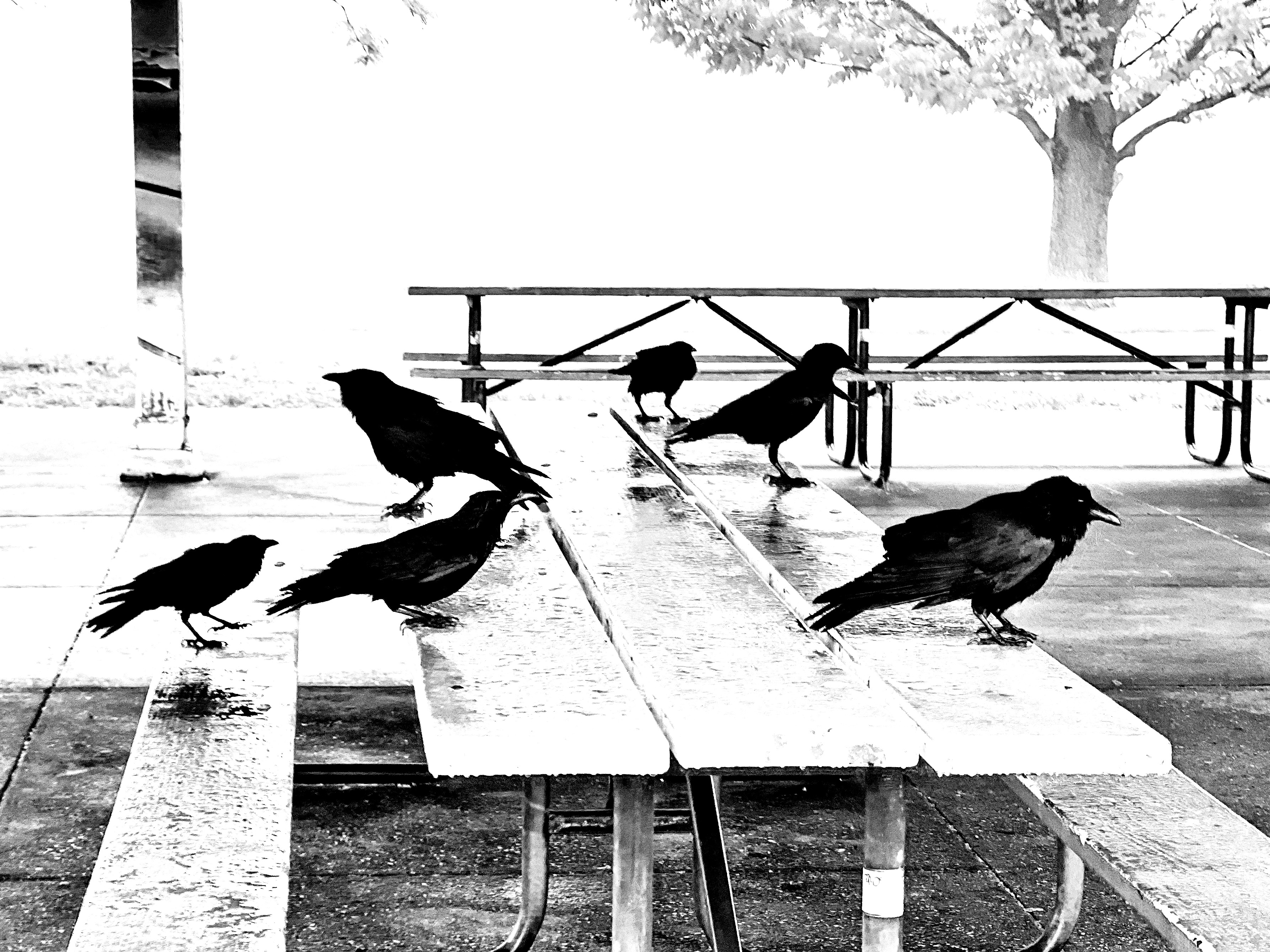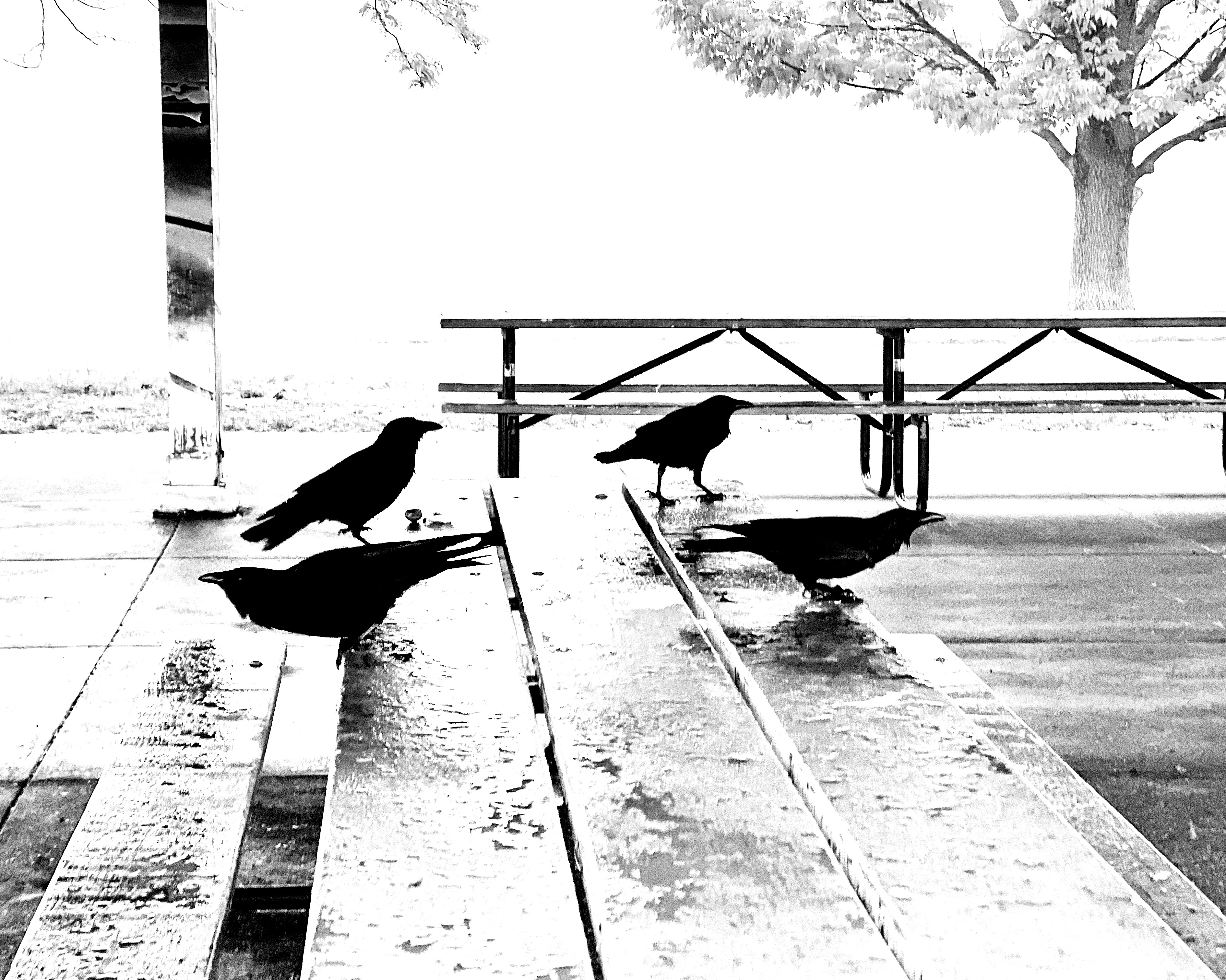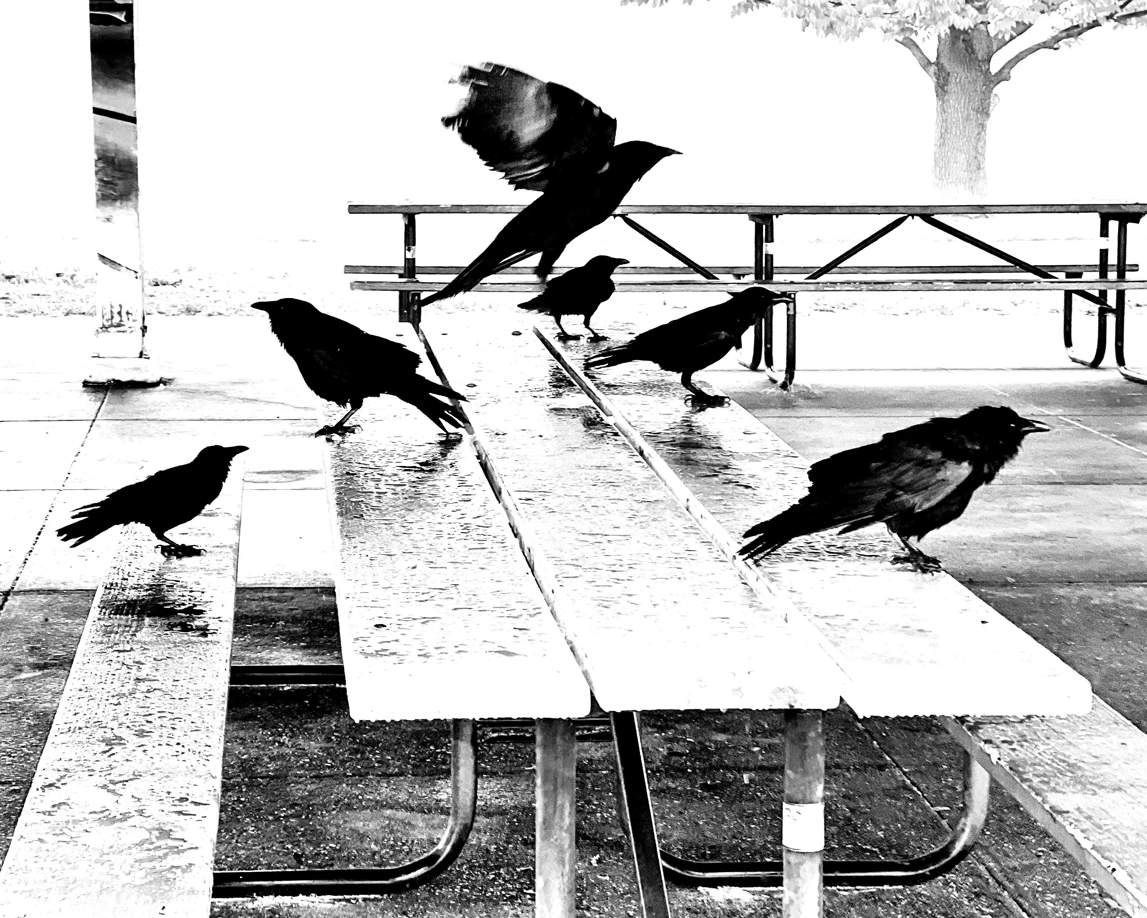 Here’s a series of “stark monochrome” edits on photos as I approached a murder of crows — the official name for a group or gathering of them (look it up!) — muttering to each other on a table at the park.