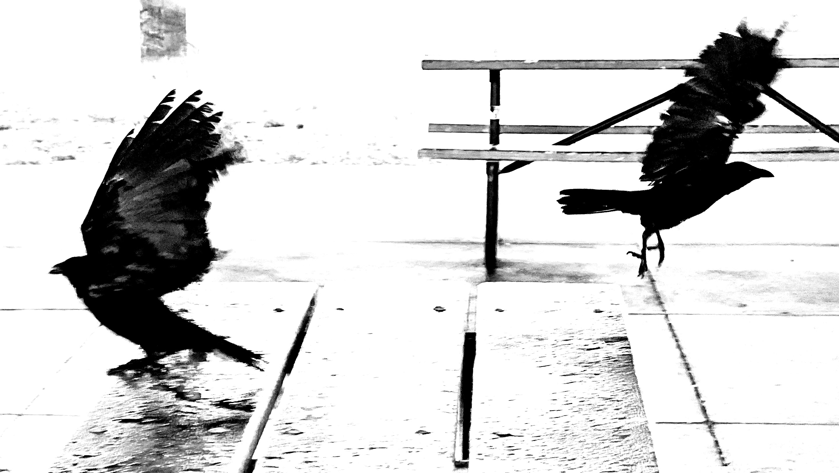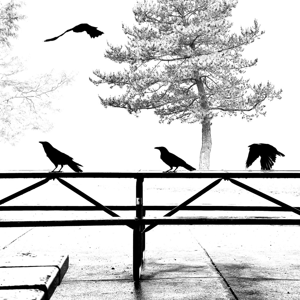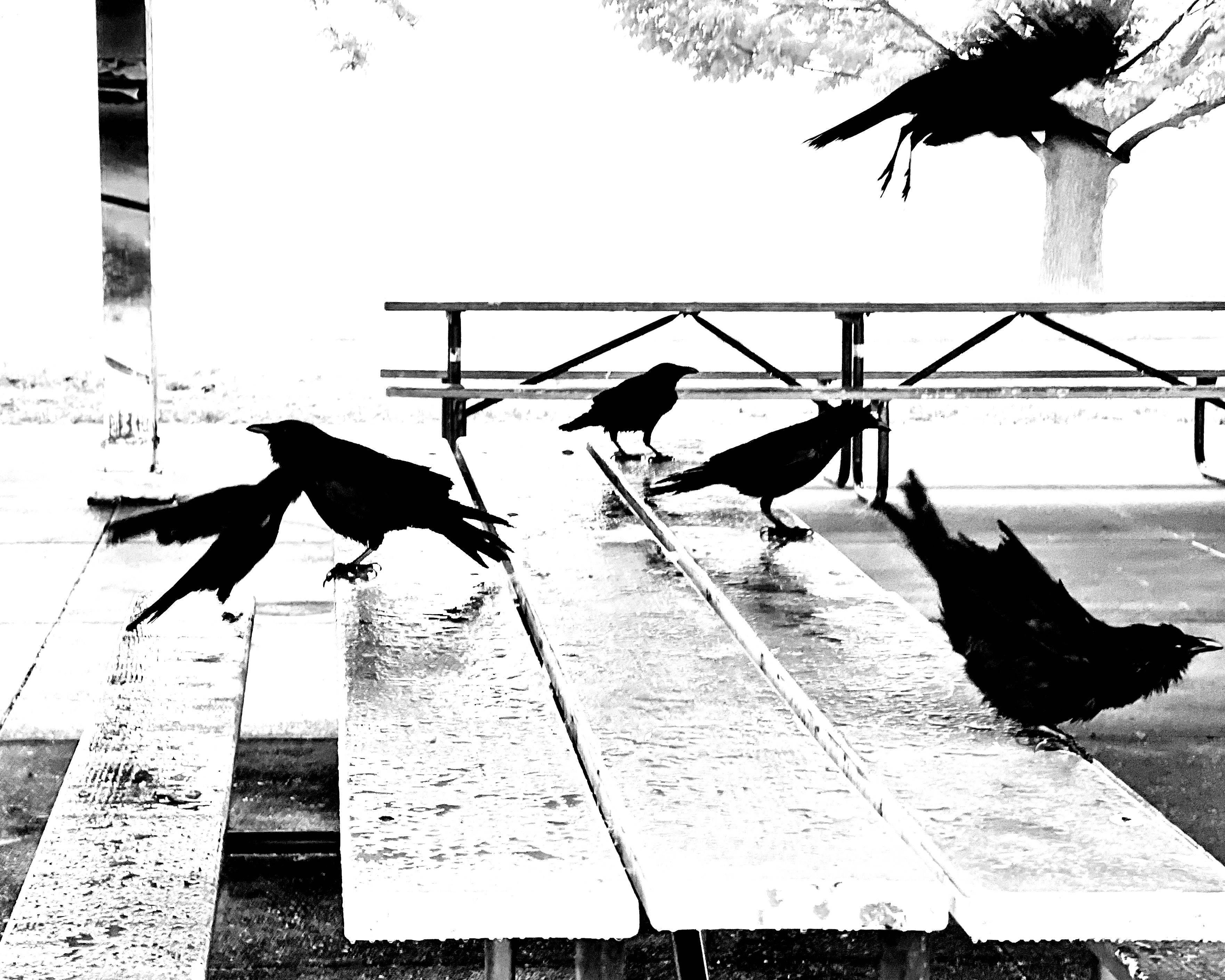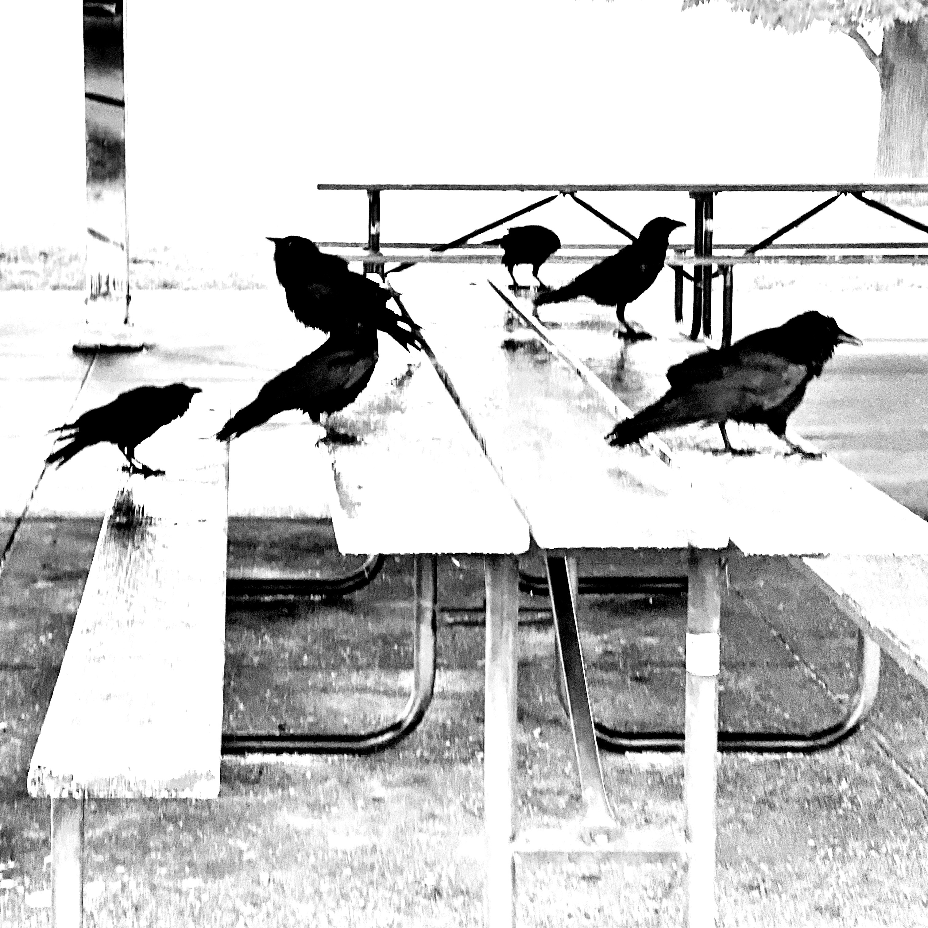 Here’s a series of “stark monochrome” edits on photos as I approached a murder of crows — the official name for a group or gathering of them (look it up!) — muttering to each other on a table at the park.