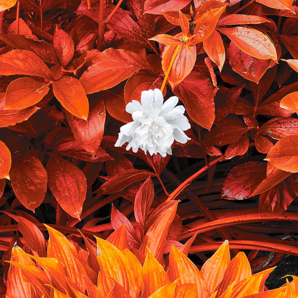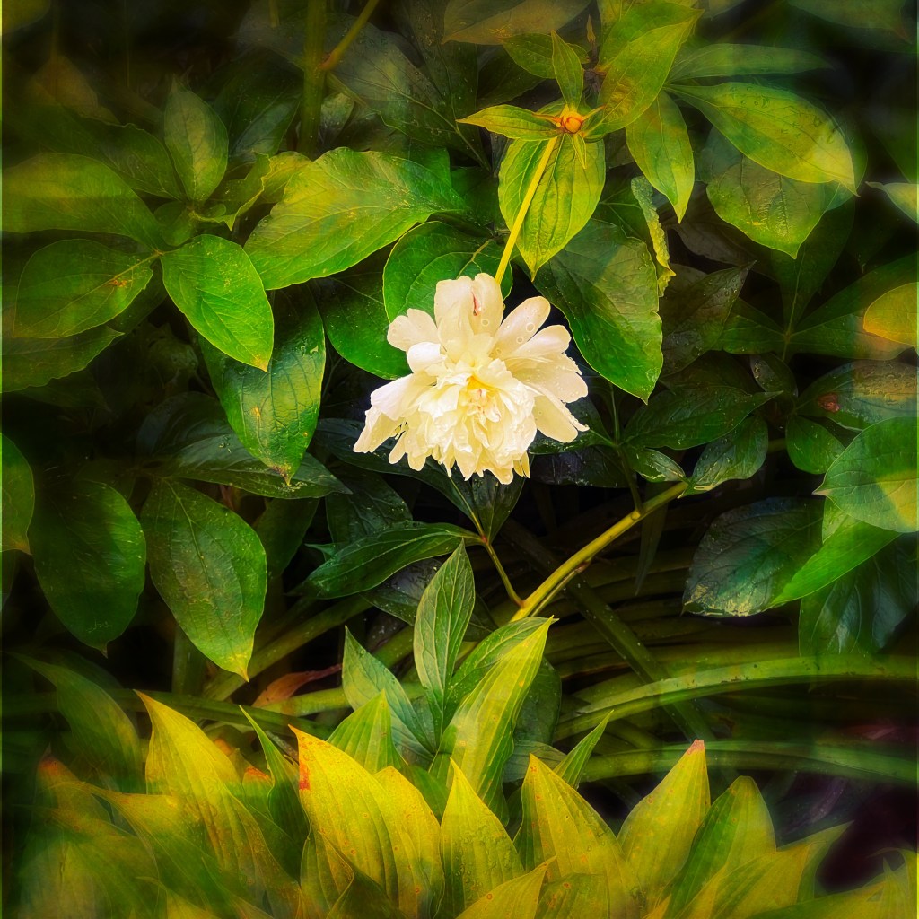 Before I waste any more time comparing a flower to a dog, let’s talk about how peonies grow and become so big-headed. They start popping up from their bulb-roots in late April or early May (in my NE US region) and grow quickly to a height of 2-3 feet (60-90 cm) with a spread of 3-4 feet (90-120 cm). The stalks are slender, firm, and strong, with several branches and bunches of almond-shaped leaves radiating around each stalk.