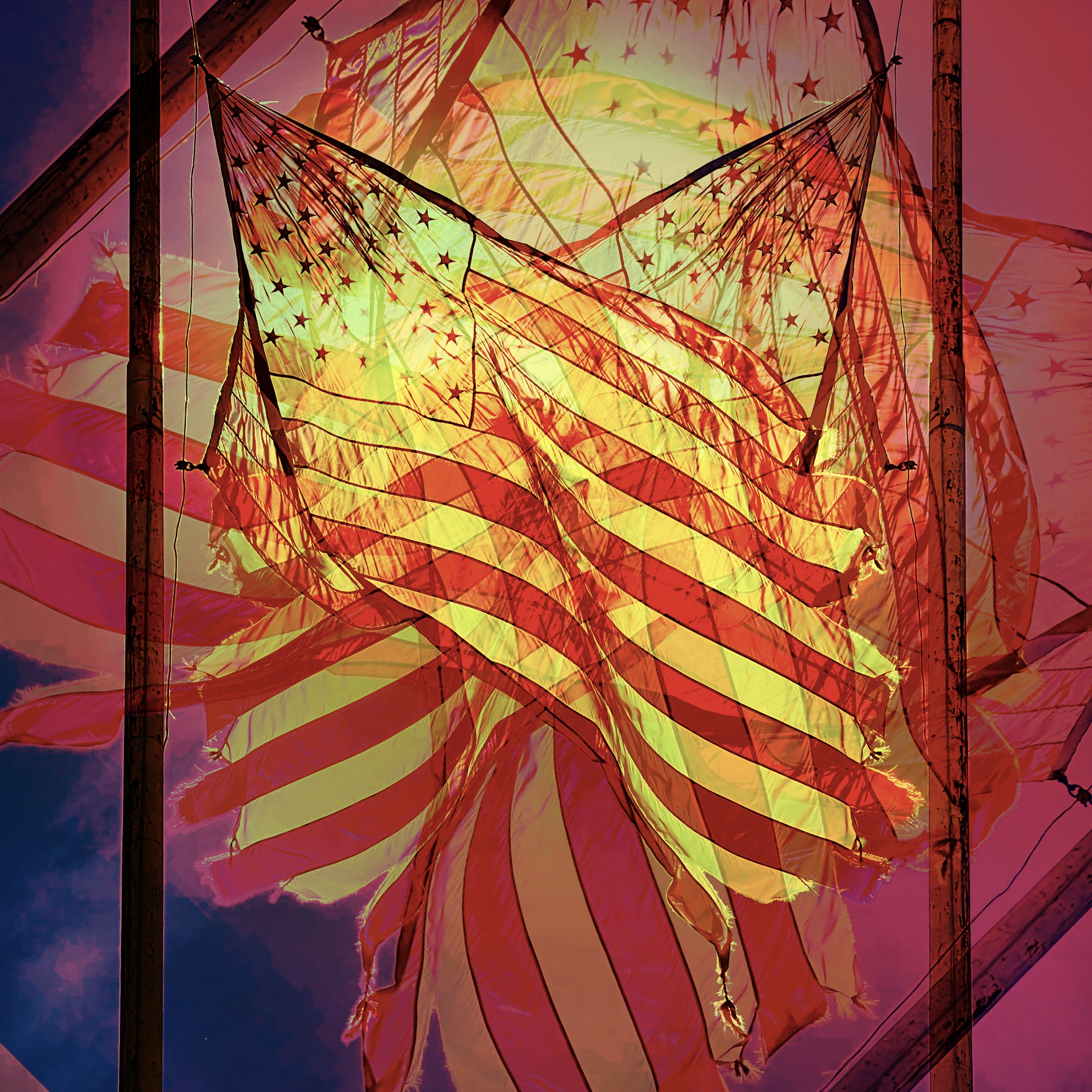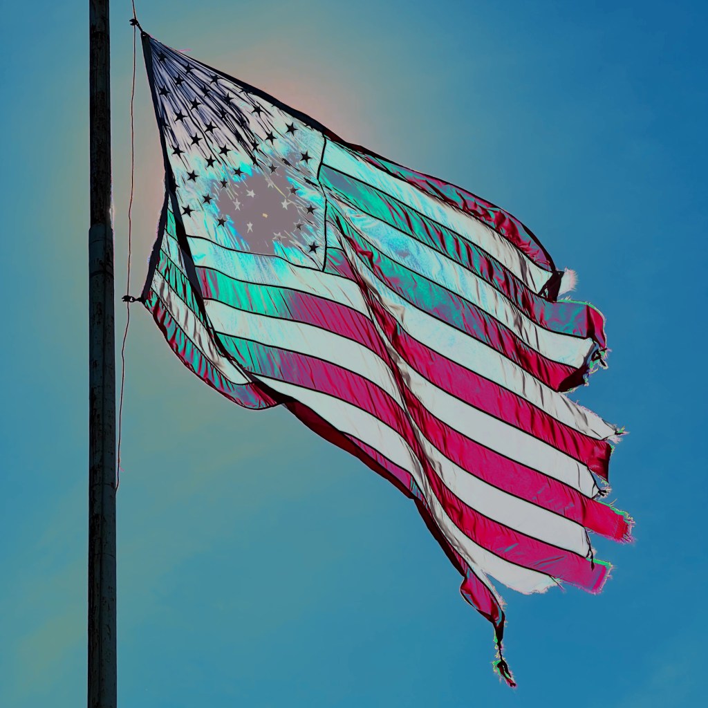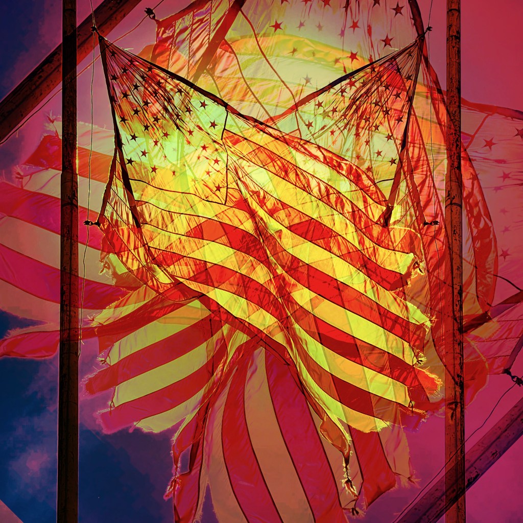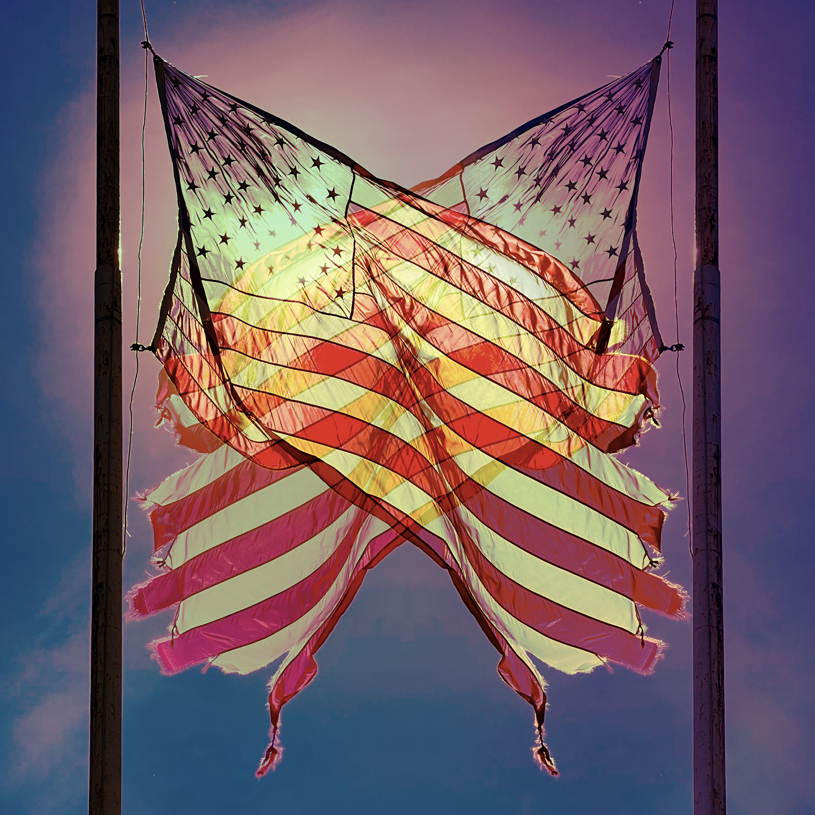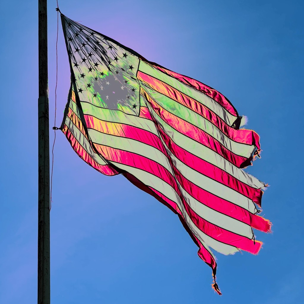Today’s photos are a series of edits, riffing on that ripped and tattered American flag flying at half-mast (for reasons unknown, or just forgotten) with the morning sun shining through it. I wanted to visually communicate separateness and sameness, splitting and symbiosis, tearing apart and joining together at the same time.