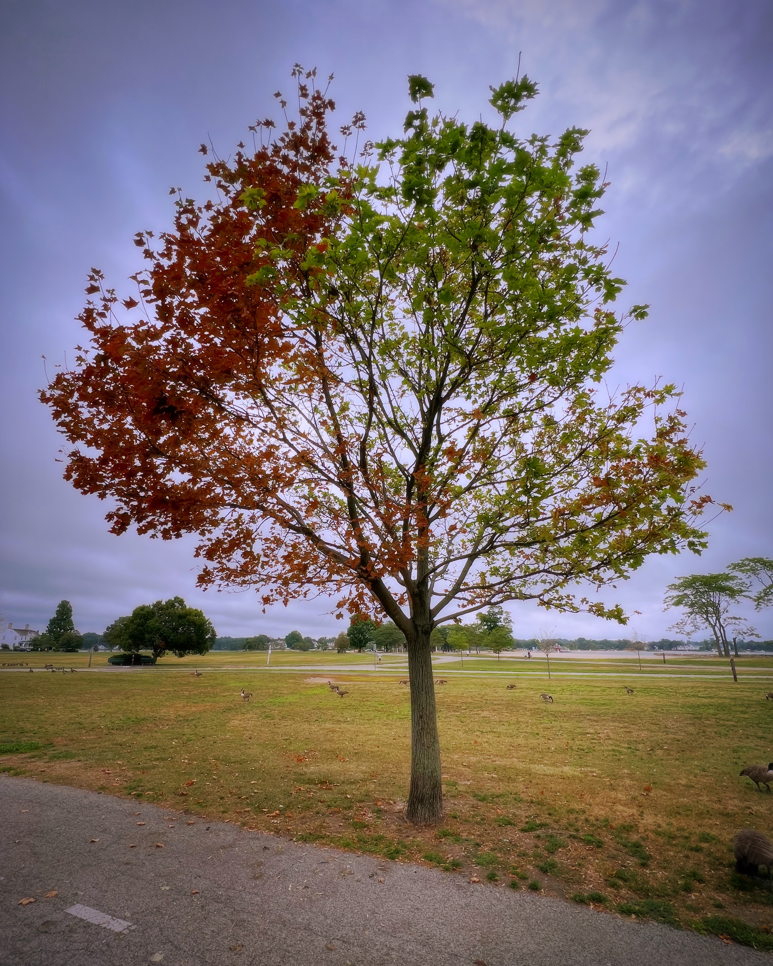 As August winds down and prepares to transition into September, one of the trees in Stamford, Connecticut near the shores of Long Island Sound has decided that half of itself was ready to make the autumn change — a month (or more) ahead of schedule!