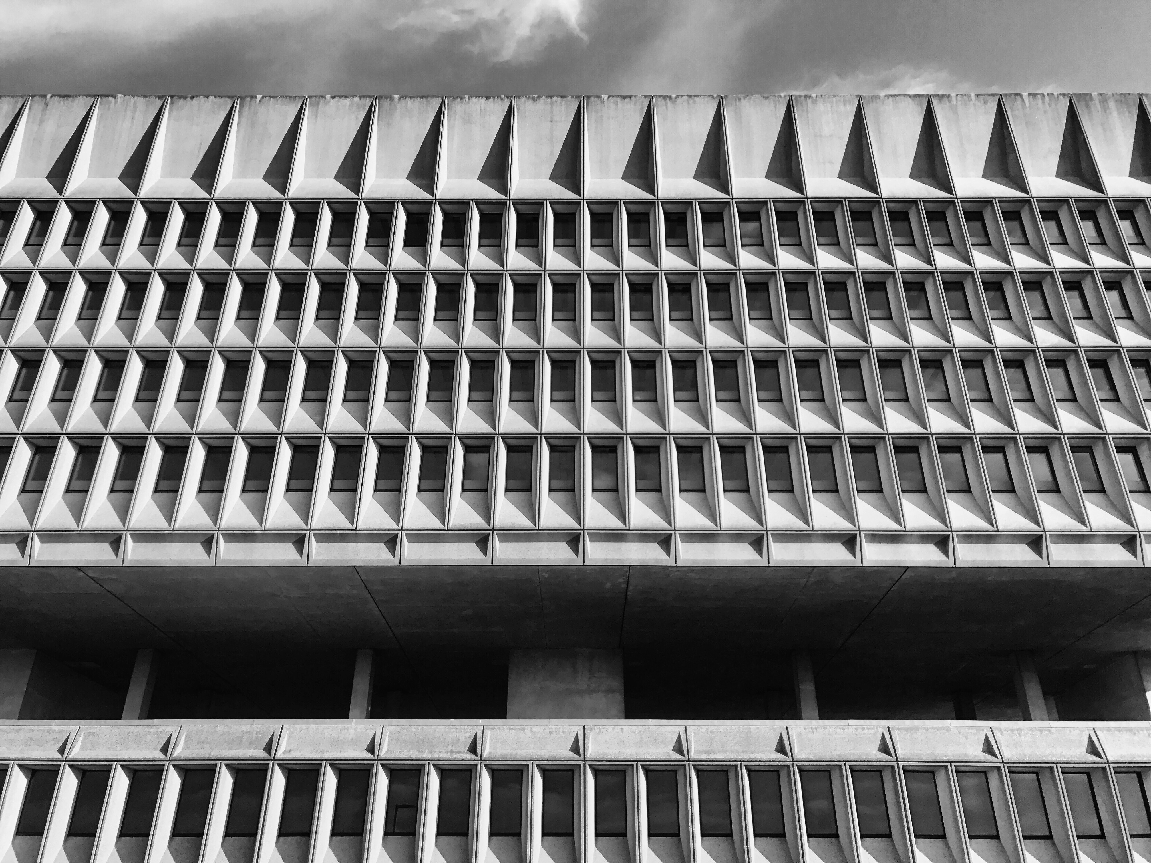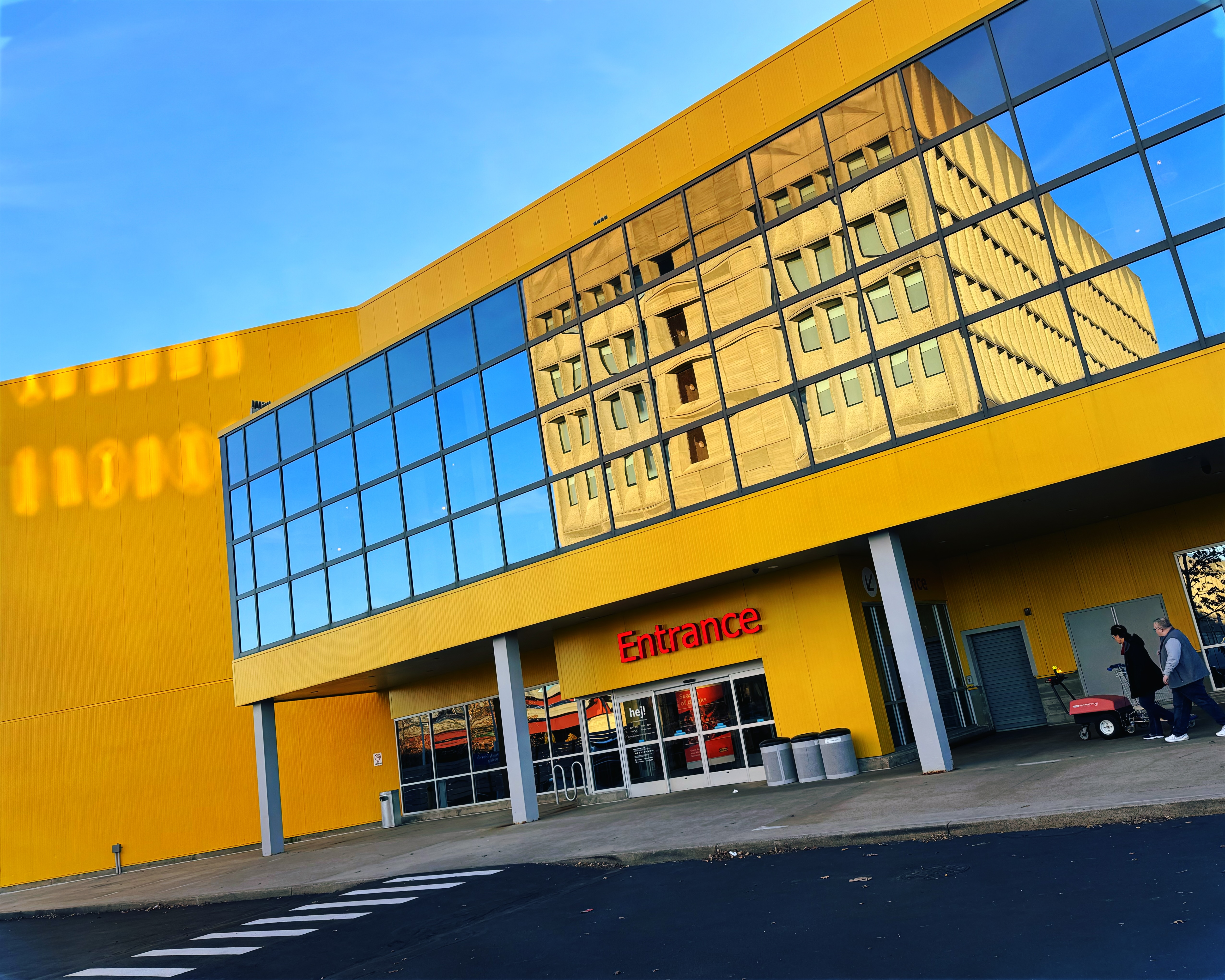 Afternoon sunlight creates dark triangles and lines in sharp contrast to the weathered concrete exterior; windows reflect light onto pavement, people, cars, trucks, and the IKEA next door.