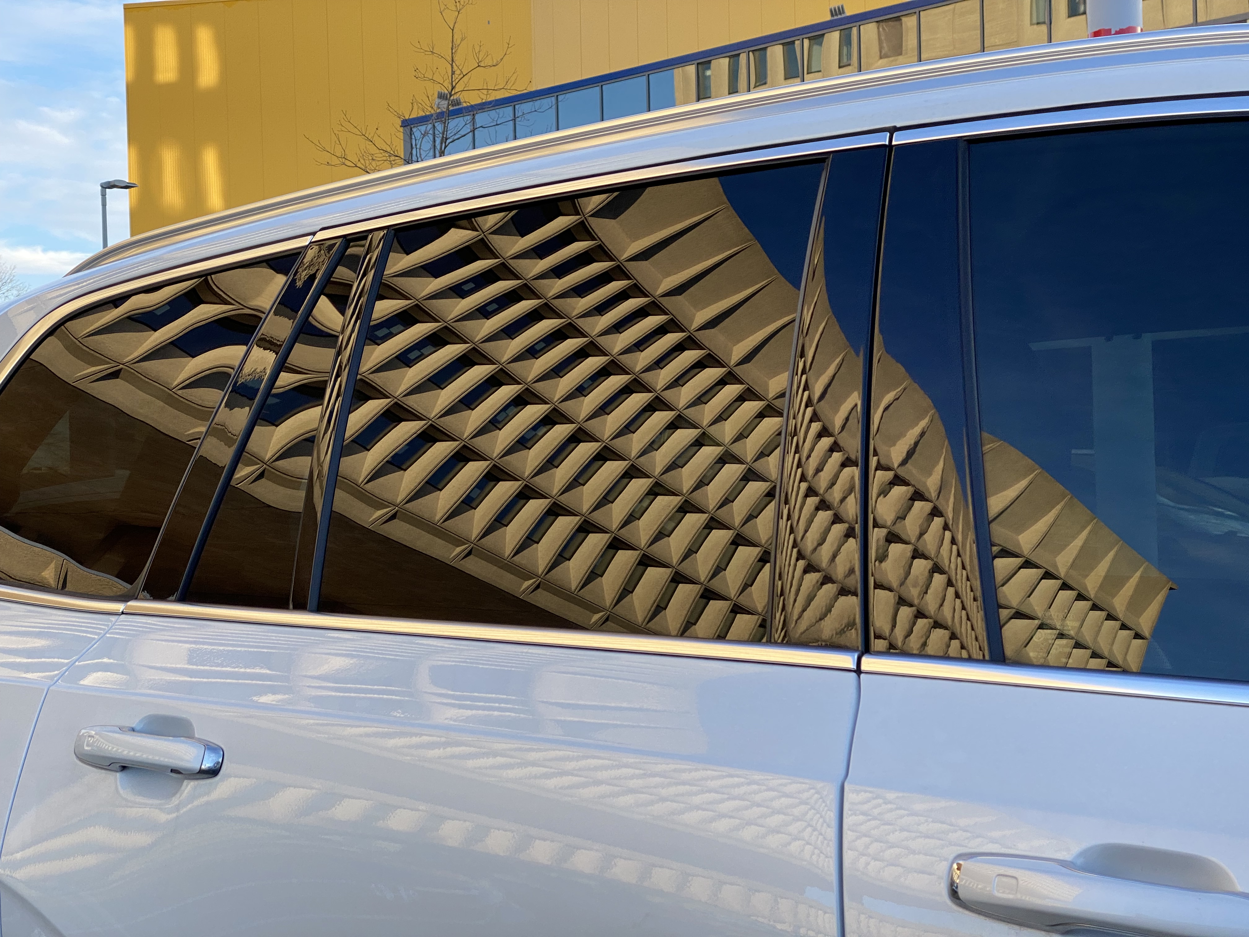 As you can see, there’s a grim geometry to the building which is somewhat interesting, but a bit drab and difficult to photograph. Finally, after repeat visits to the site (yes–shopping at IKEA) in various weather conditions and at different times of day, I discovered the building’s secret: It comes to life on any clear afternoon, when sun hits the northwest-facing side!