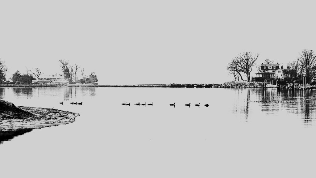 Went to walk by the beach at high tide, on a cold winter morning, under diffused light through gauzy clouds. I noticed a group of random geese, which magically lined up, queued up, and aligned with the distant causeway bridge behind them…
