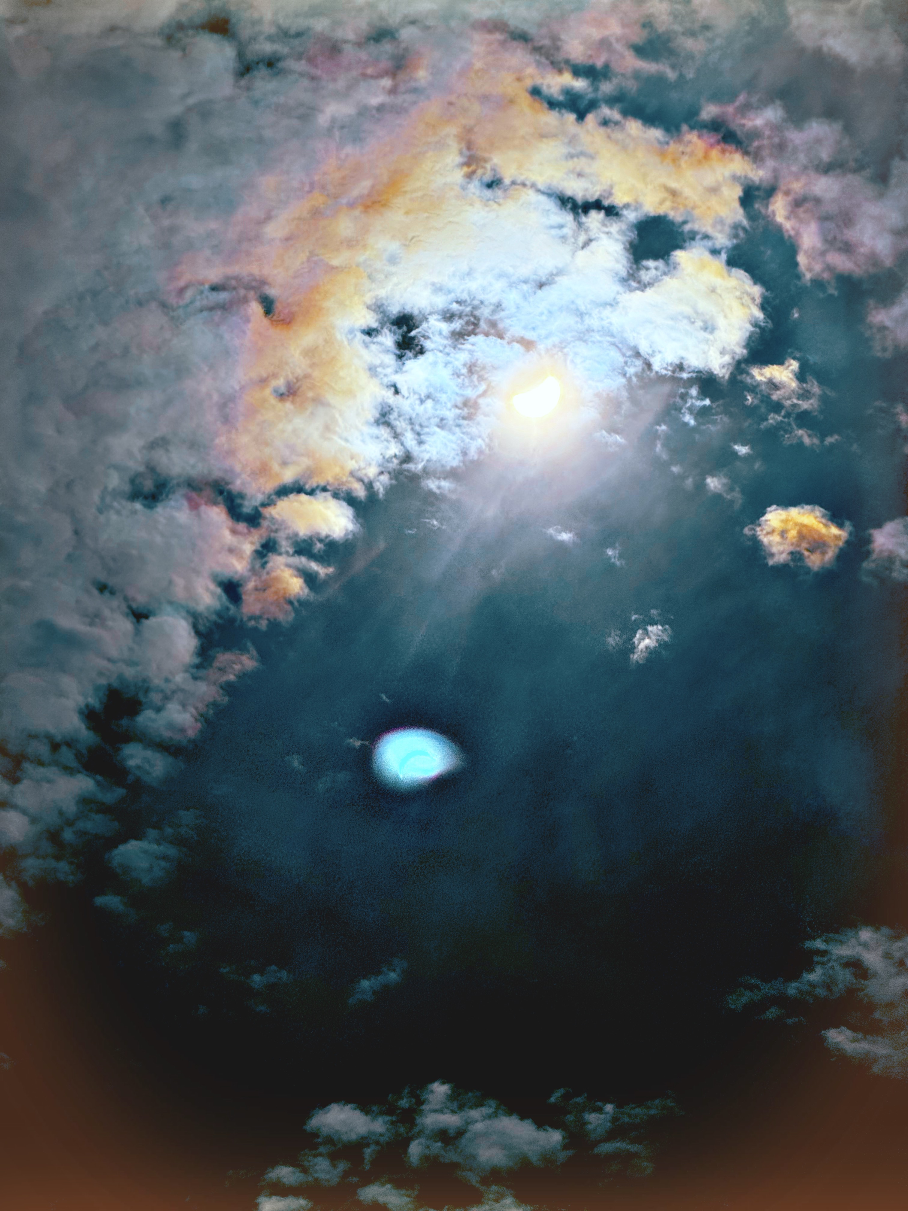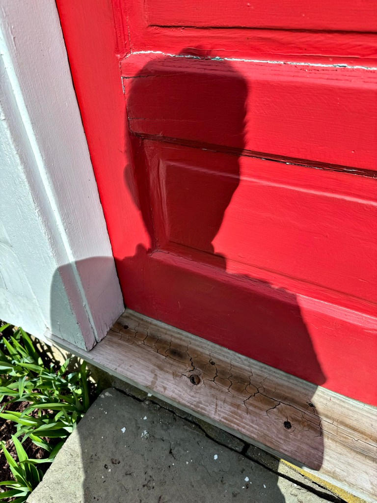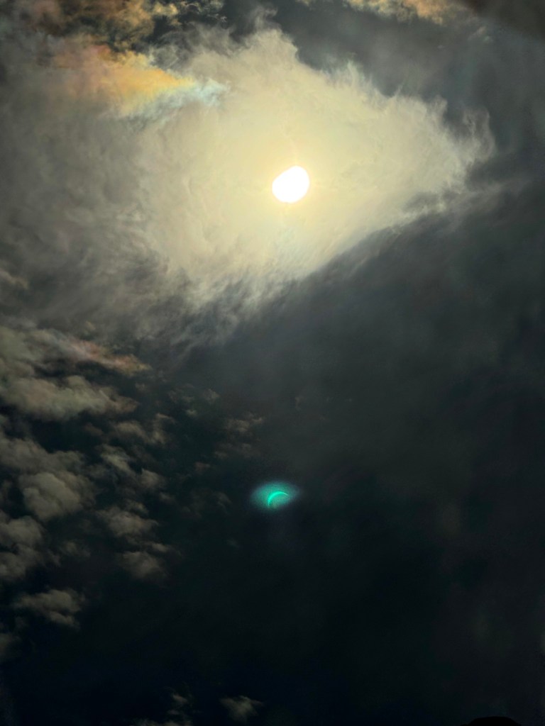 I looked around for a way to indirectly photograph the celestial event, hoping to avoid damage to my eyes and/or my iPhone camera. The dirty glass pane of the garage door was in direct sunlight, and seemed to be a good place to point my iPhone safely. I put it on the “telephoto” lens setting, crept forward, looking only at my phone screen, until the sun appeared, and clicked away…