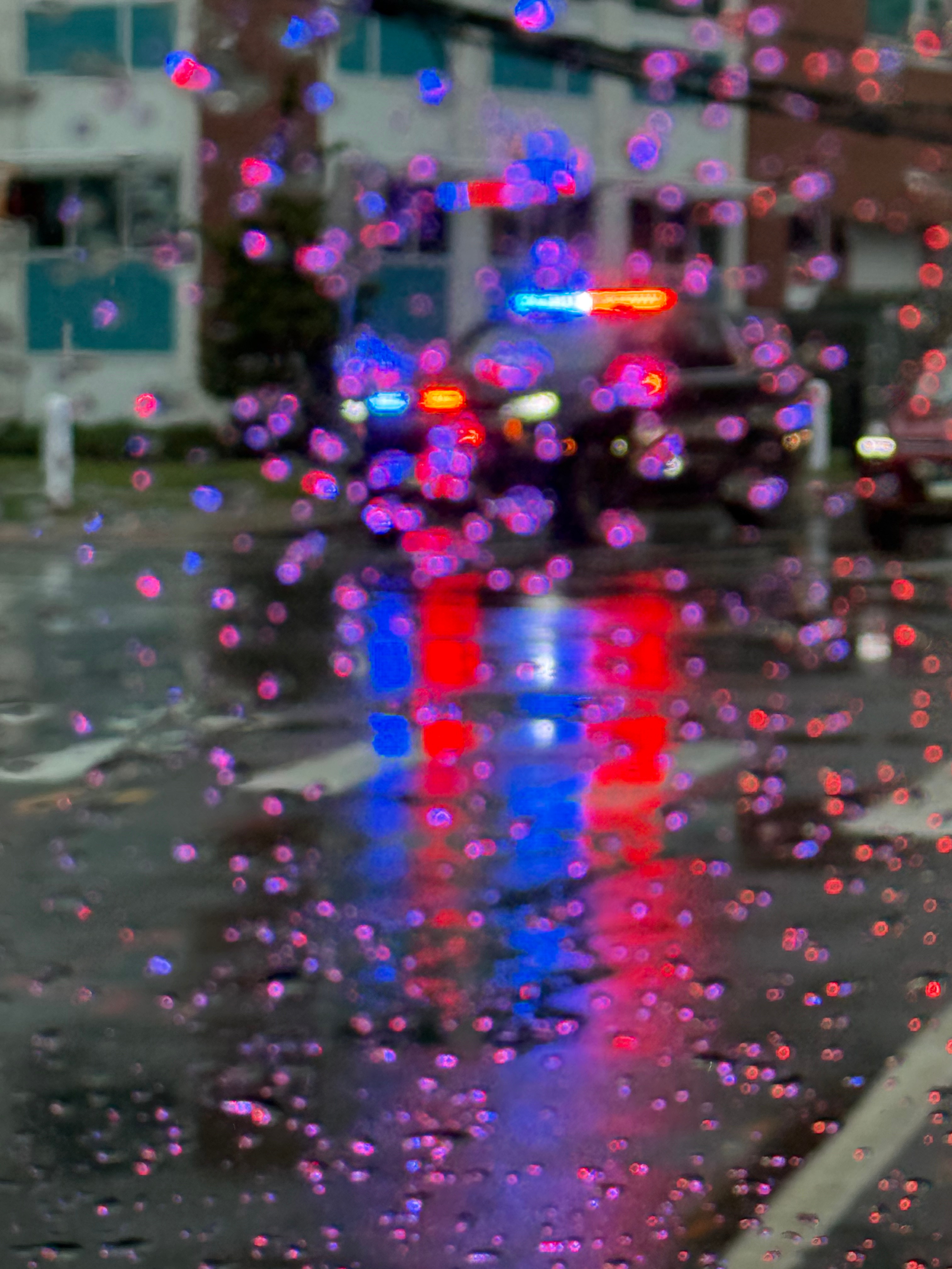 Subject: Police Car in Rain at Dusk through Raindrops on a Windshield.